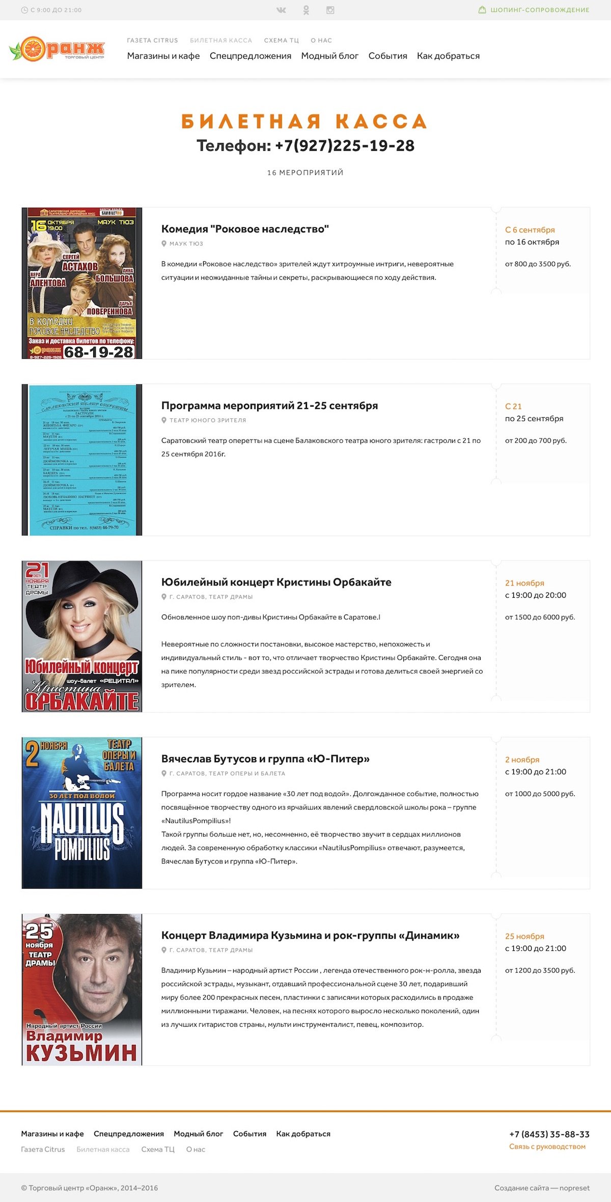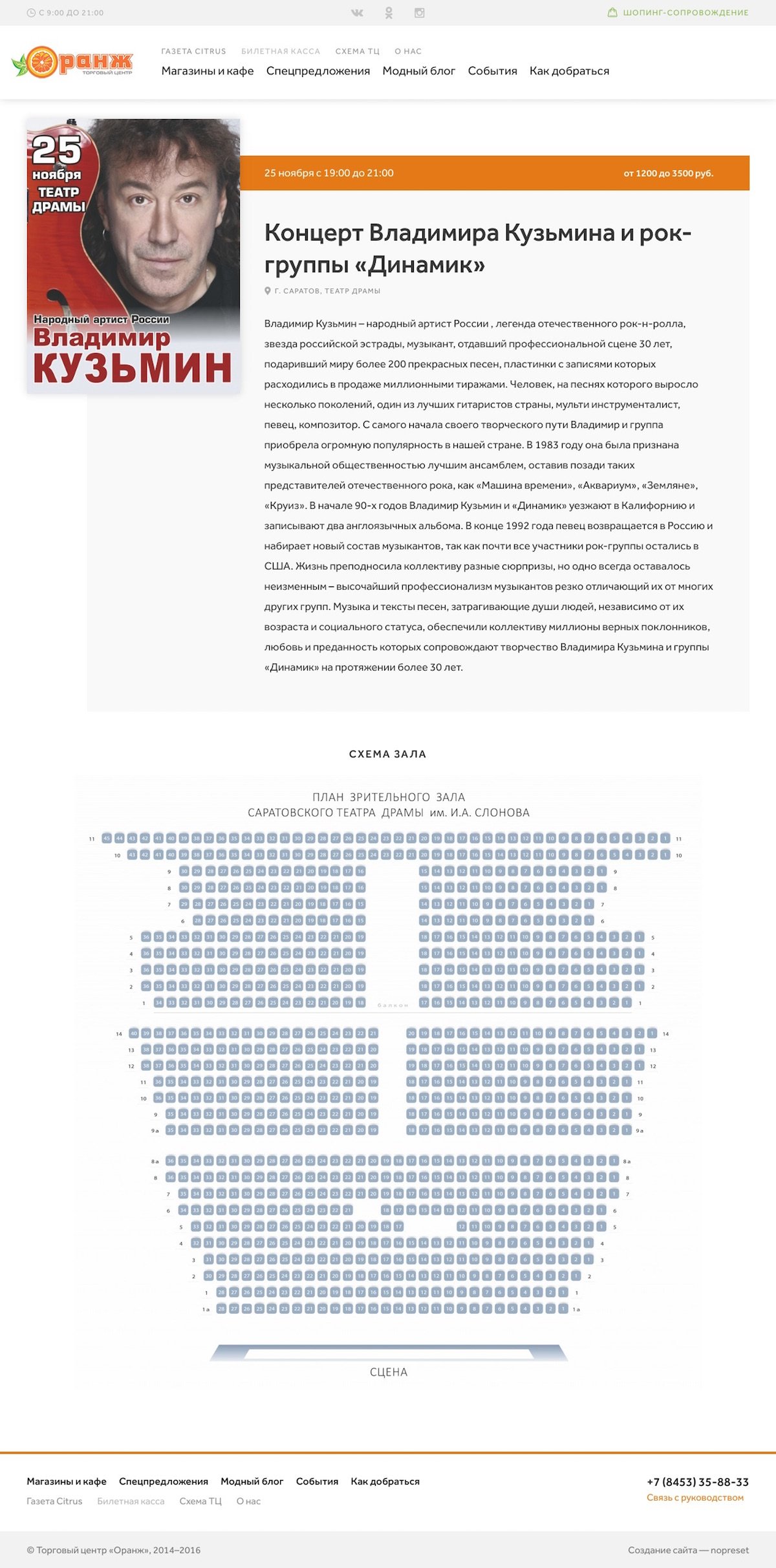 На сайте нужно было разместить информацию о магазинах, находящихся в ТЦ, разработать билетную кассу для продажи билетов в театр и на концерты.