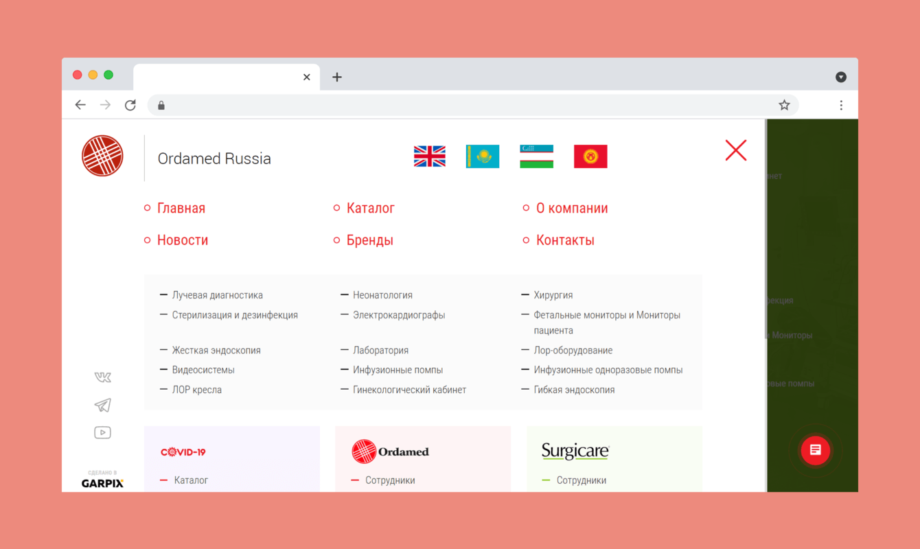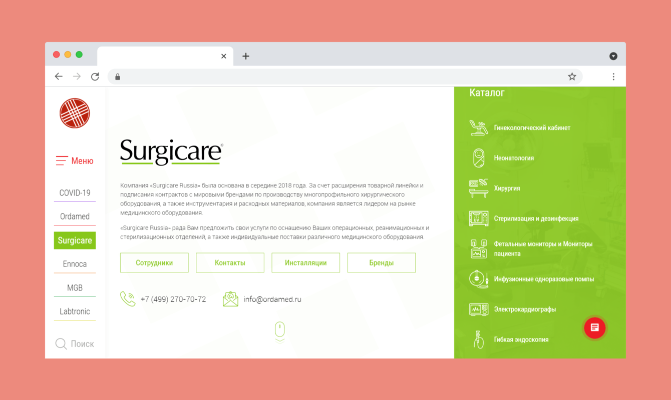 Создать сильный имиджевый ресурс, объединяющий шесть разрозненных сайтов компаний, входящих в холдинг Ordamed Group Russia. При этом требовалось обеспечить каждой компании узнаваемость и идентичность внутри большой единой системы. Основная сложность заключалось в том, что все компании разноплановы, имеют свою историю, бренд-бук и собственный дизайн.