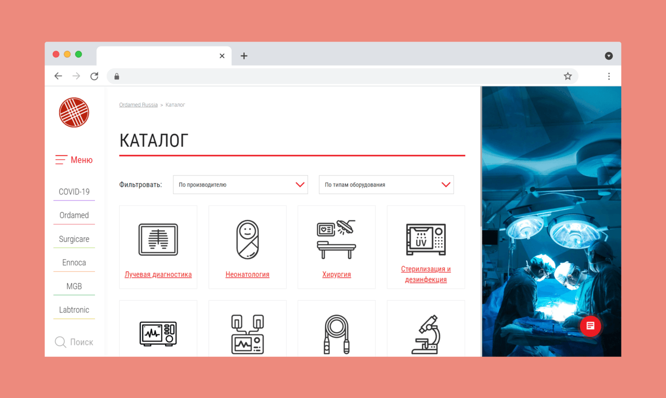 Интегрировать на сайт каталог продукции в соответствии с разделами и по направлениям компаний, при этом обеспечить клиентов всех типов (дилеров, собственников и врачей частных клиник, врачей и руководителей государственный медицинских центров) наиболее полной информацией о каждом товаре.