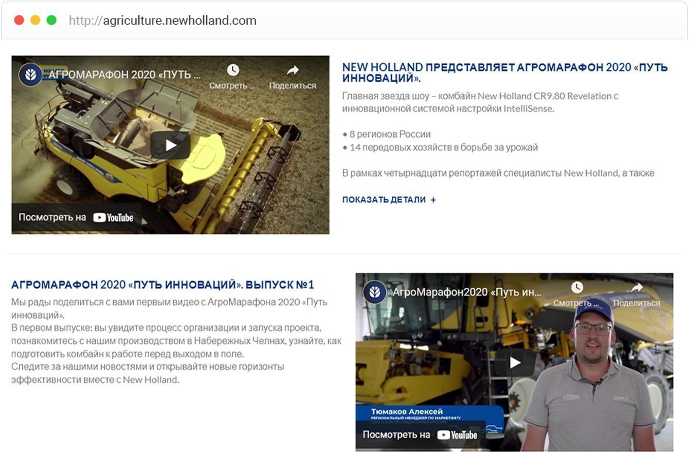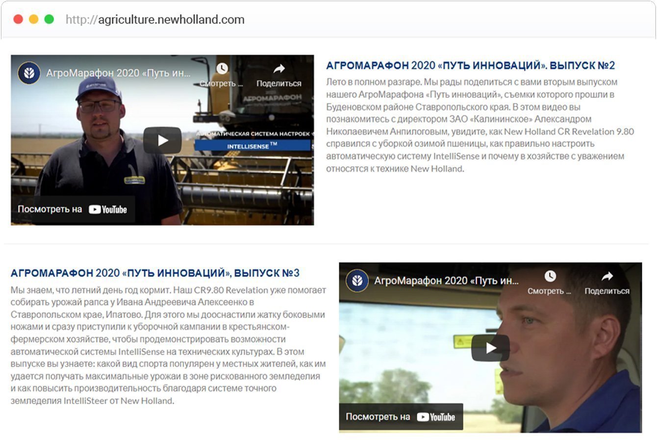 • Сняли видеоролики, показав возможности нового комбайна и жизнь внутри передовых хозяйств. Ролики выходили в соц.сетях New Holland Agriculture раз в неделю.