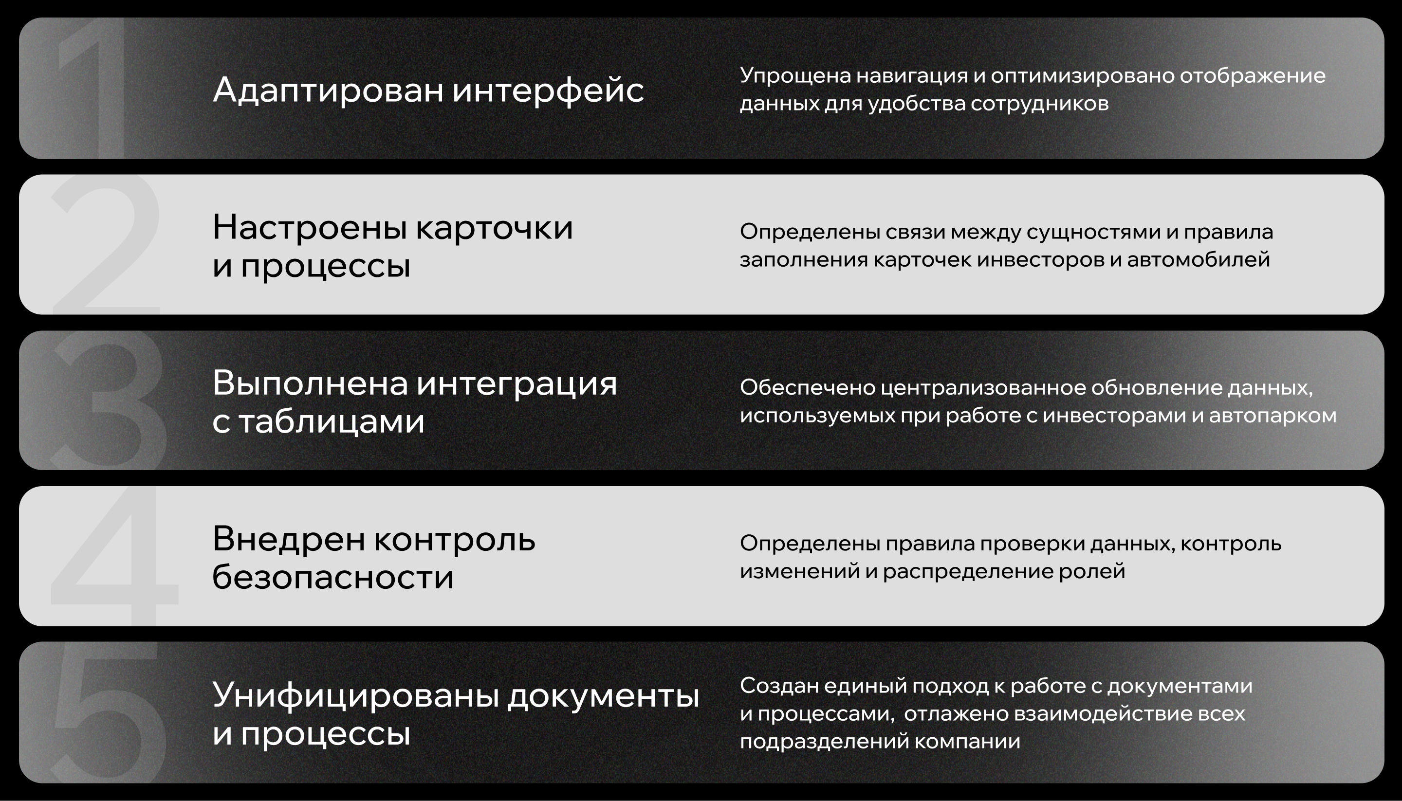 Новые настройки позволили выстроить единый подход к работе с информацией и процессами, обеспечить прозрачность операций и создать удобную систему для взаимодействия всех подразделений компании при сопровождении инвесторов и автопарка.
