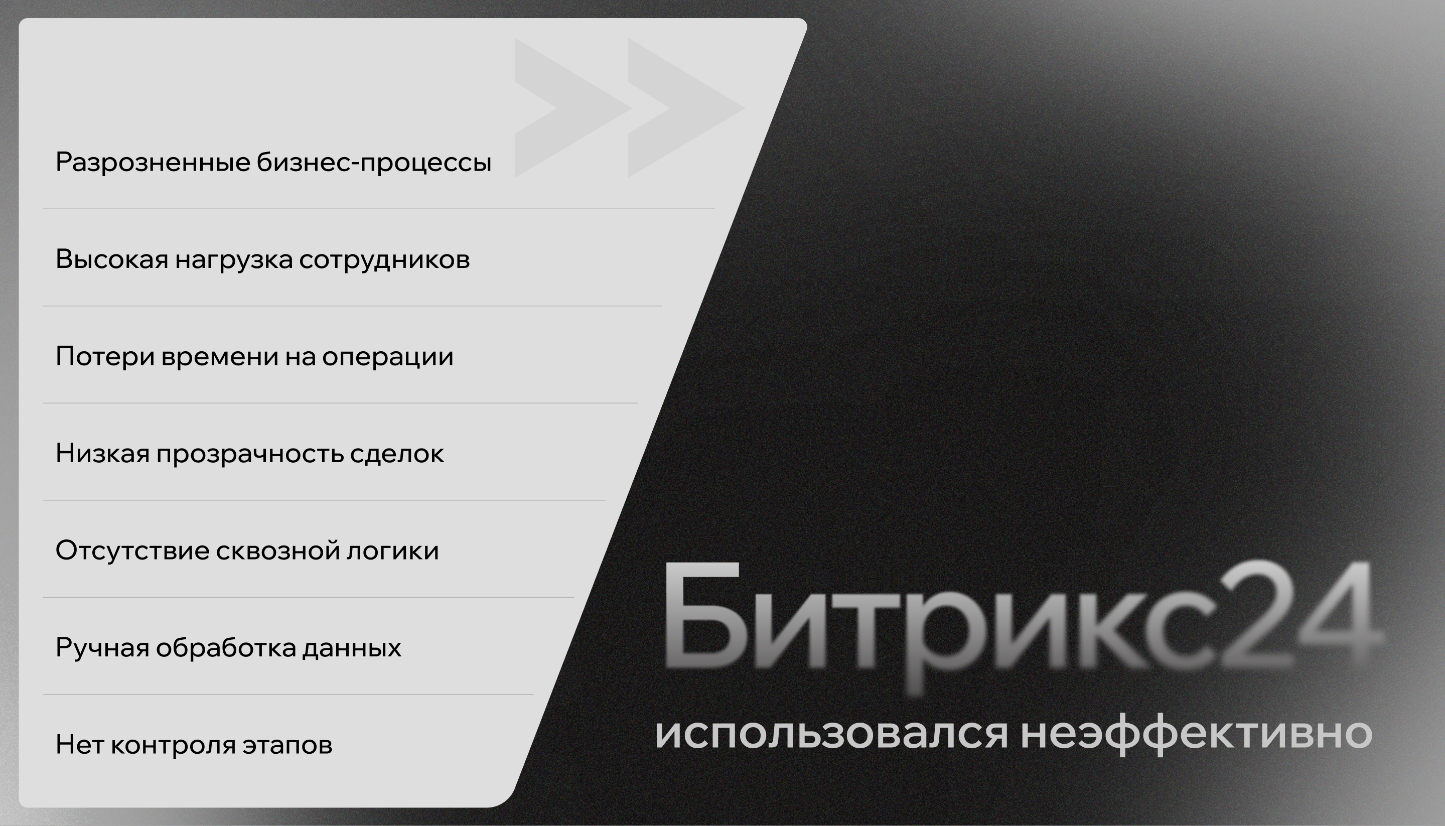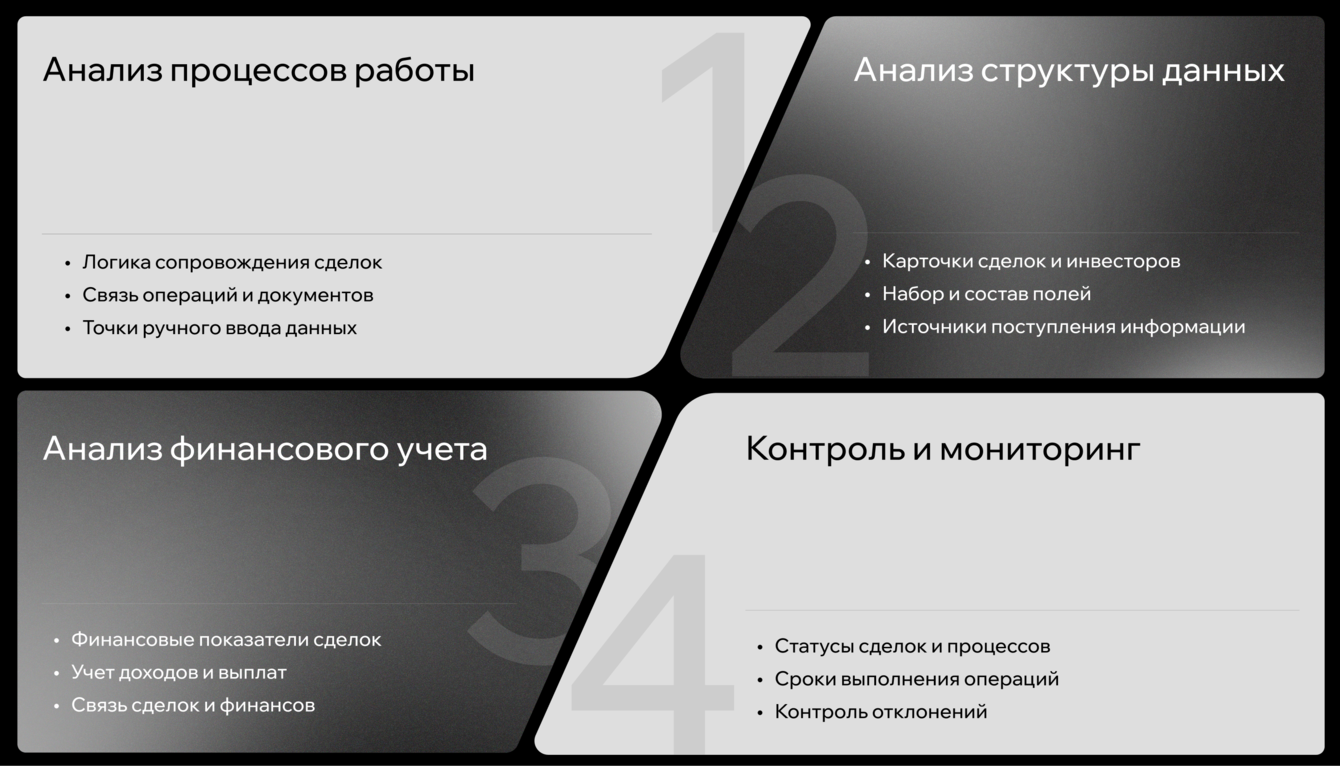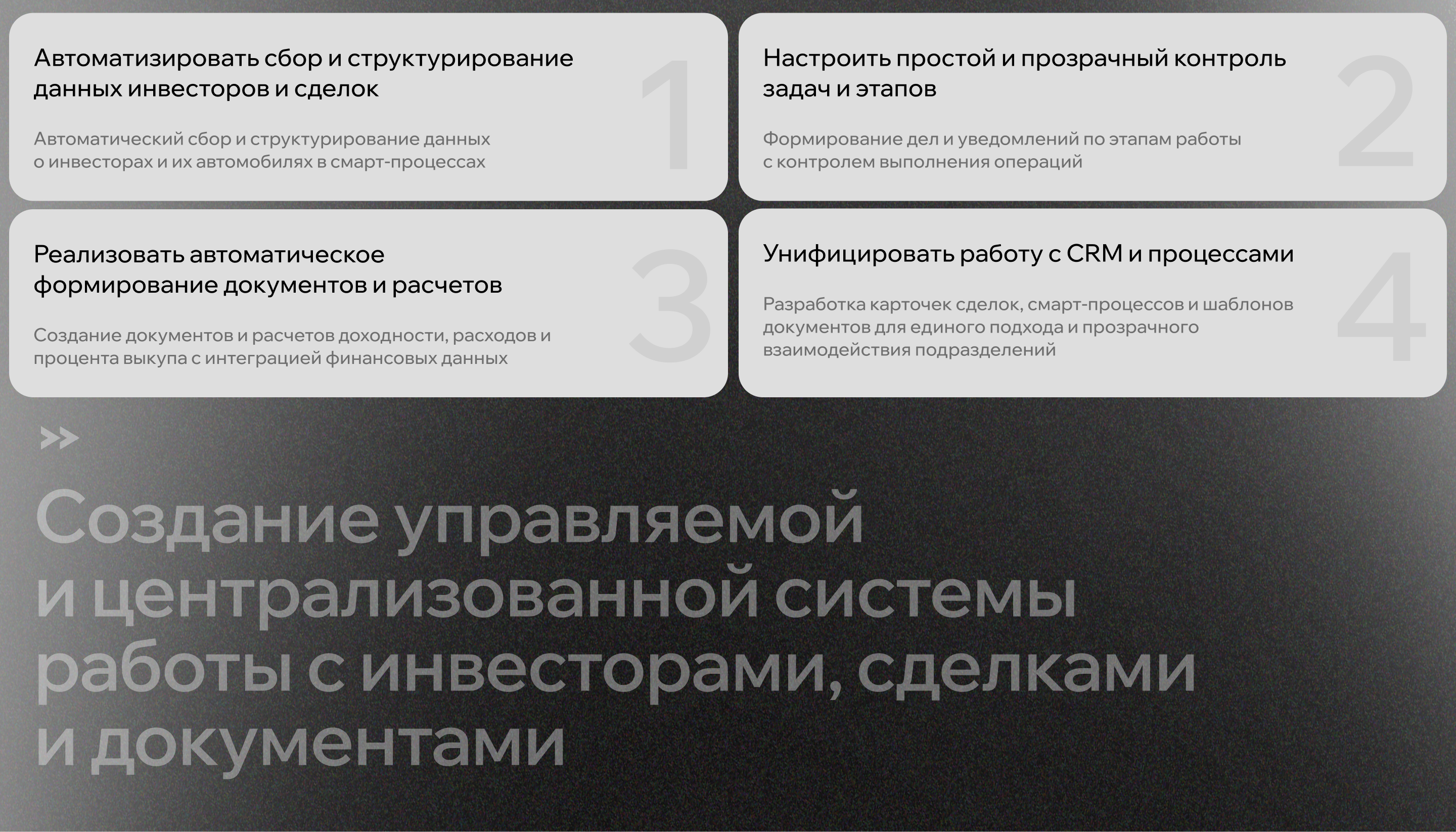 Информация по инвесторам, автомобилям и сделкам хранилась в разных разделах CRM и внешних источниках, многие операции выполнялись вручную, а контроль задач, документооборота и финансовых показателей не был связан с конкретными стадиями сделок. В результате система не отражала реальную картину бизнеса и не использовала свой потенциал, что потребовало привлечения внешнего партнера для выстраивания прозрачных и управляемых процессов.