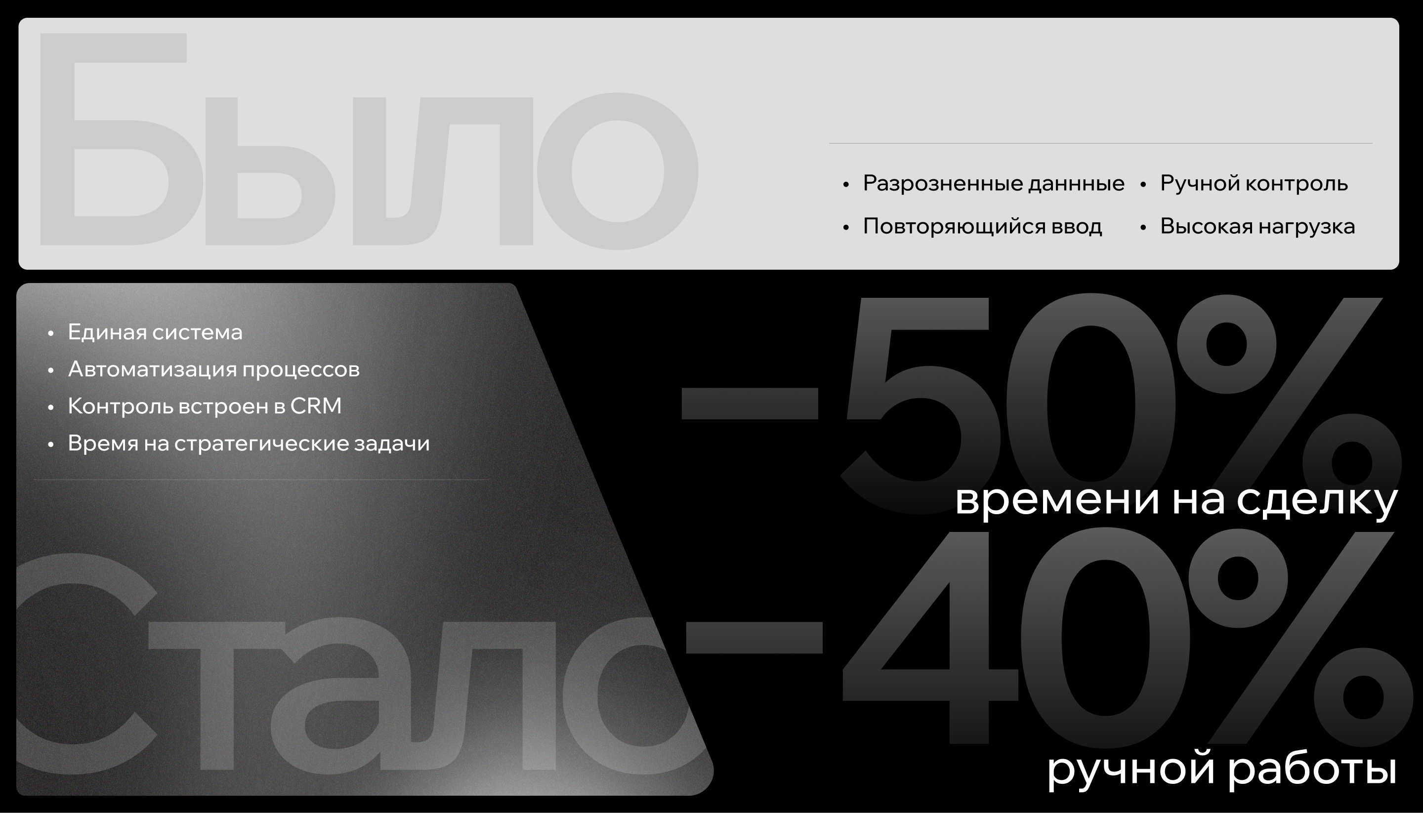 - Ускорение обработки информации и принятия решений — время на обработку одной сделки сократилось почти на 50%.