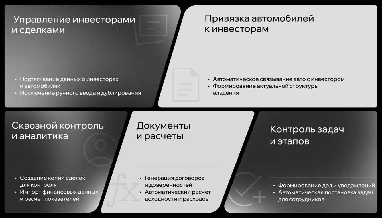 После этапа анализа процессов и погружения в специфику бизнеса Moscar Finance мы определили ключевые направления работы, которые позволили использовать весь потенциал CRM, ускорить обработку информации и повысить прозрачность управления инвестициями и автопарком. Основной целью стало выстраивание логики работы с инвесторами, автопарком и документами, а также минимизация ручного труда сотрудников.