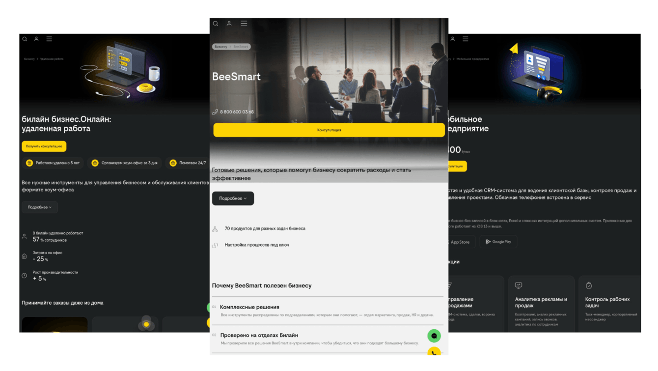 Разработали прототипы страниц и показали, как Билайн Бизнес открывает новые перспективы для людей и бизнеса по всей стране.