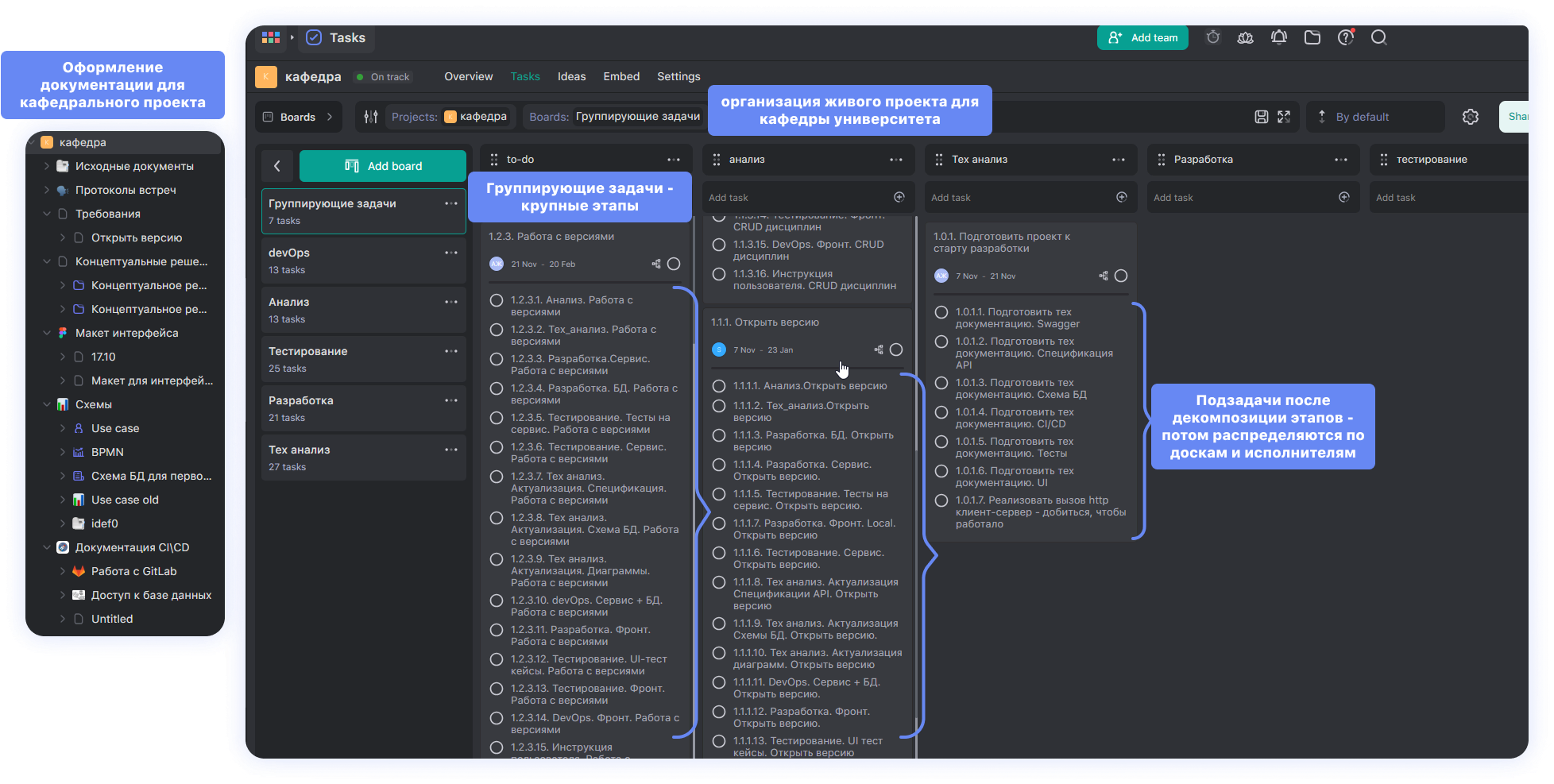 Систему документации для этого внутреннего проекта — требования, макеты, версии, концептуальные решения и прочее — сформировали в WEEEK в отдельном проекте «Кафедра».