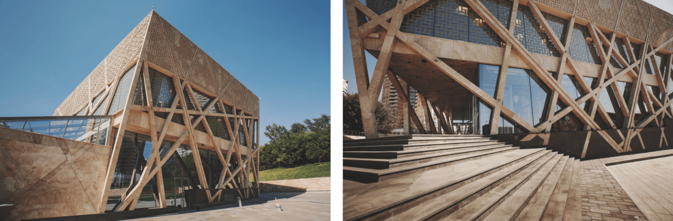 В качестве основного дизайнерского решения мы использовали архитектурную особенность здания ресторана — наклонные колонны. Отразили визуально на носителях внутренний интерьер зала.