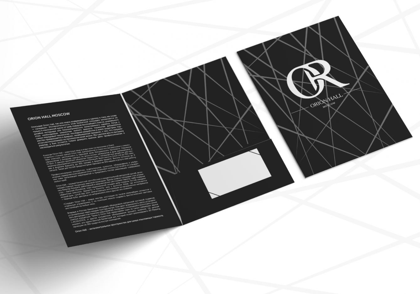 Дополнительной задачей была разработка папки со схемами зала. Они были перерисованы в векторный формат, коррелирующий со стилем пространства. На обложке фирменные линии выделены уф-лаком, что еще раз позволяет обратить внимание на концепцию, воплощенную в каждой детали.