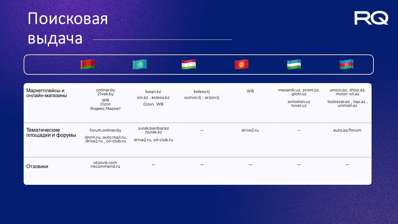 Благодаря анализу поисковой выдачи нам удалось получить более глубокие данные по покупательскому поведению в разных регионах. Так, например, в регионе РБ много локальных интернет-магазинов, но есть и знакомые нам маркетплейсы, в Таджикистане нет локальных онлайн-шопов, только Wildberries, в остальных регионах много локальных магазинов.