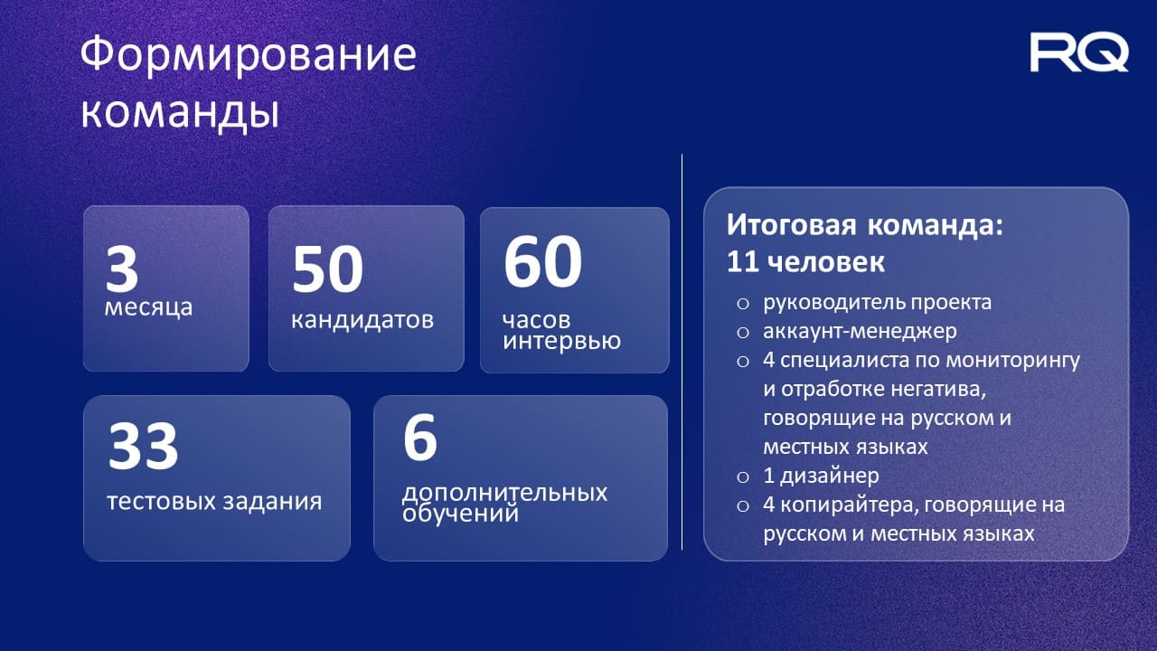 • 4 специалистов по мониторингу и отработке негатива, говорящих на русском и местных языках;