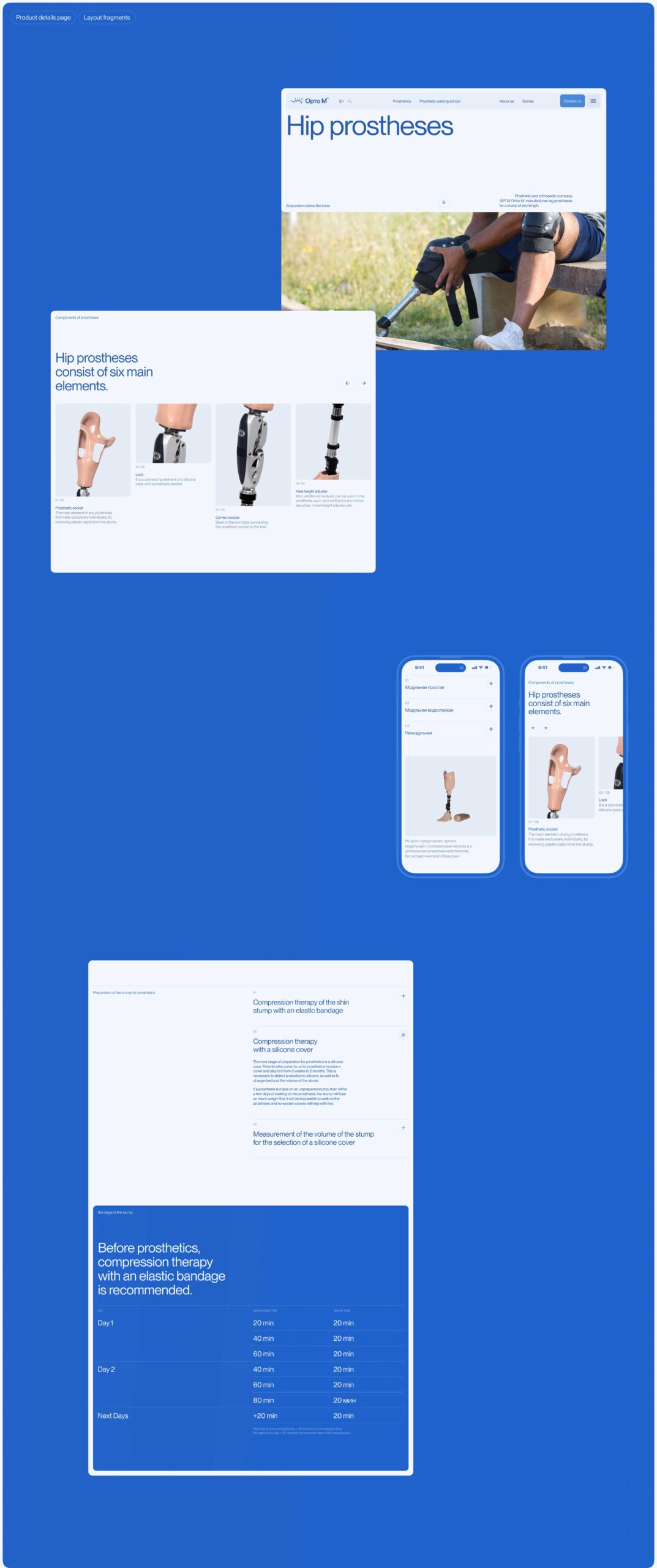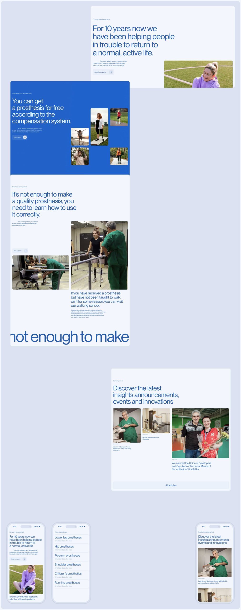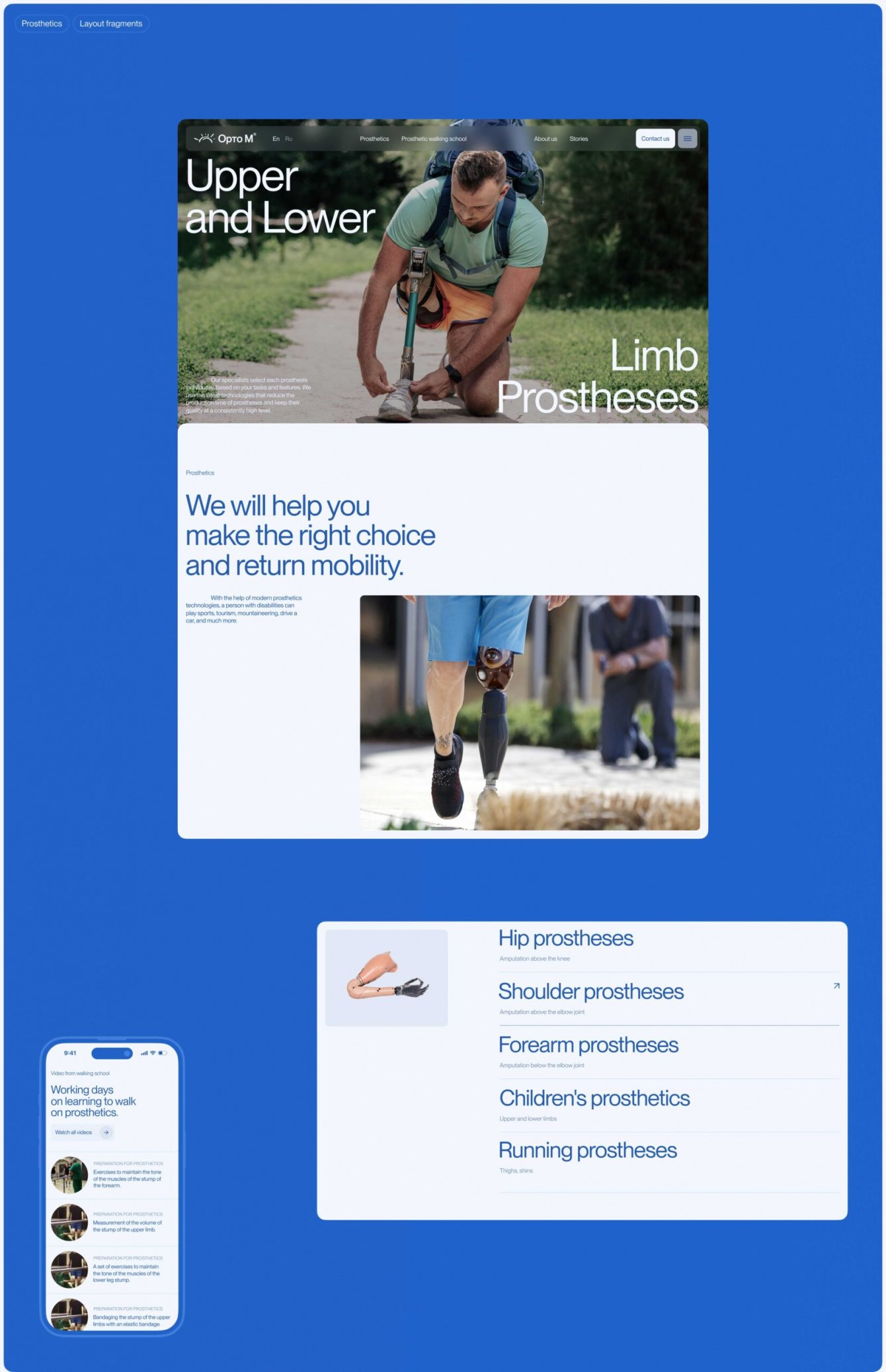 Мы поработали с сеткой контента и почти полностью изменили структуру сайта. Основными разделами стали страницы, посвященные людям, а не медицинской информации. Мы предложили сместить фокус на пациентов, чтобы показывать результаты работы компании в реальности. По нашей инициативе появился уникальный раздел “Истории”, где можно изучить реальные истории пациентов центра, которыми они делятся после восстановления в Орто-М. Отдельно мы проработали страницу "Школа ходьбы", чтобы пользователи могли подробнее изучить процесс реабилитации. На сайте удобно и четко обозначена вся информация, необходимая потенциальным пациентам центра - от цен на протезы, до графика перевязок и законодательной базы для получения выплат на средства мобильности. Все это было дейтсвительно важно структурировать, разложить "по полочкам" и представить в красивой, а главное — понятной, форме.