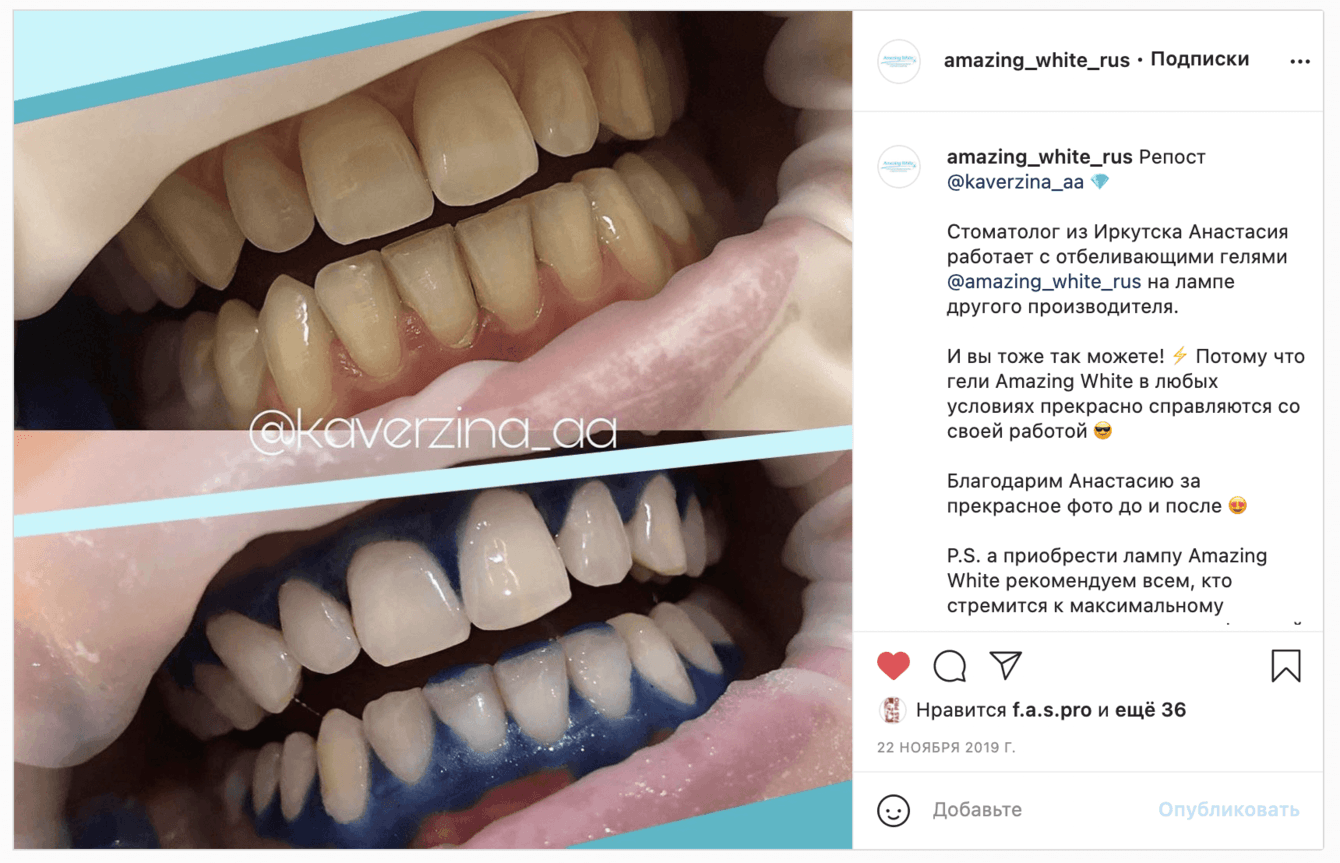 — Стоматологи, использующие продукцию компании, активно отмечают аккаунт на своих фото и в Stories.