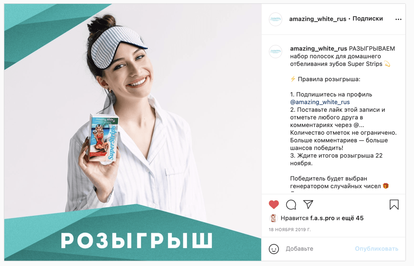 Так, в поддержку акции на полоски для домашнего отбеливания мы заказали их рекламу у двух блогеров, а позже провели розыгрыш этих полосок в аккаунте: