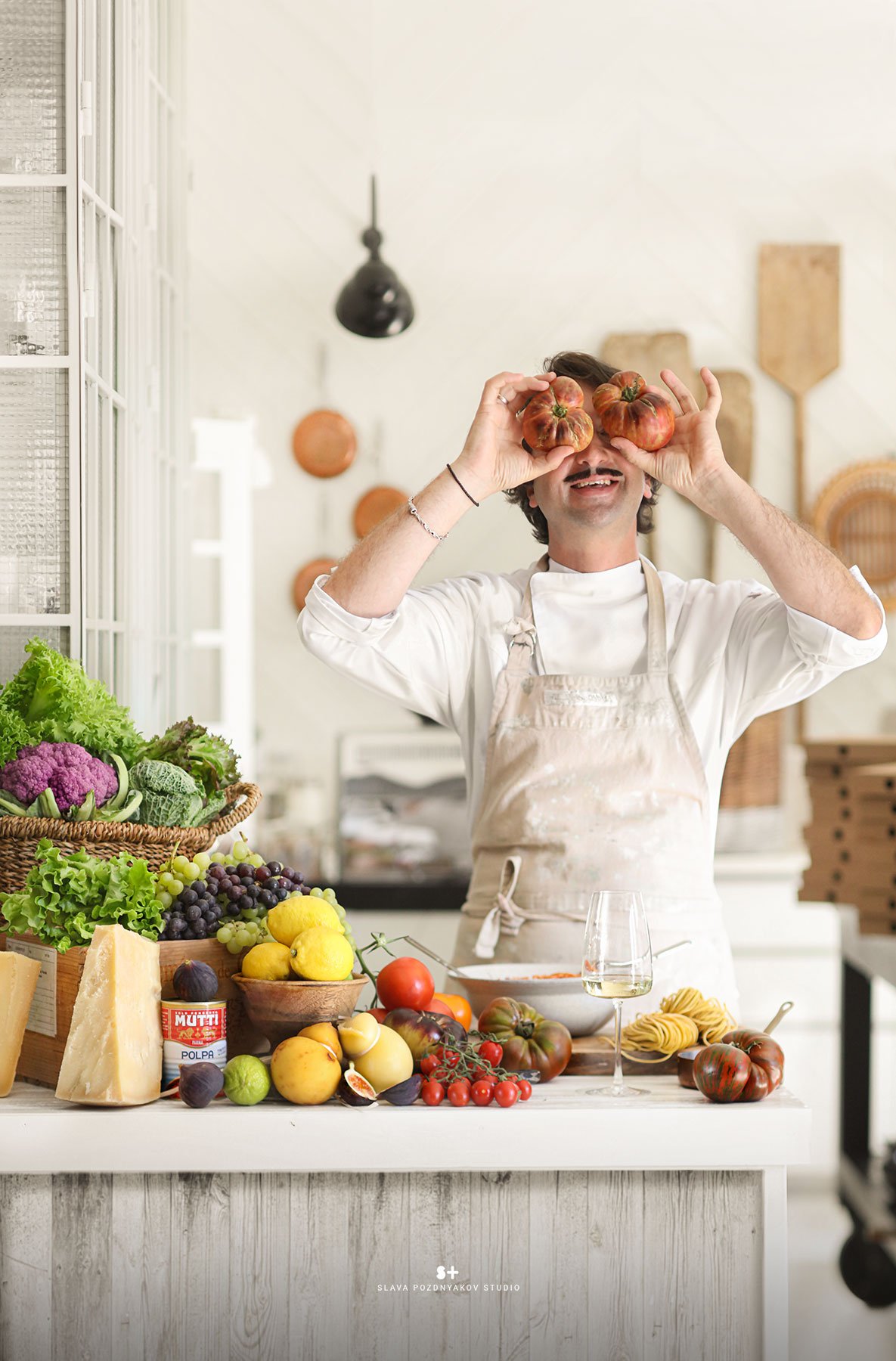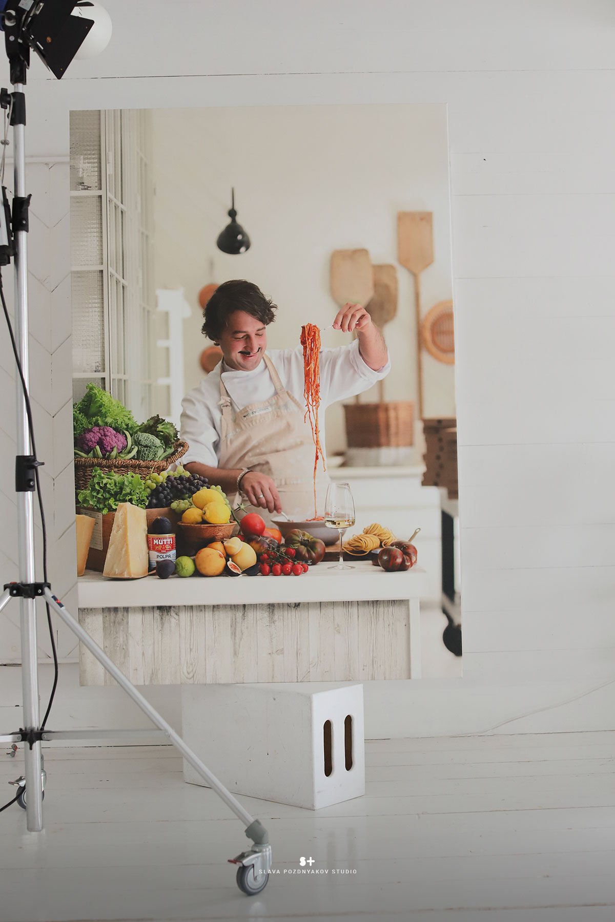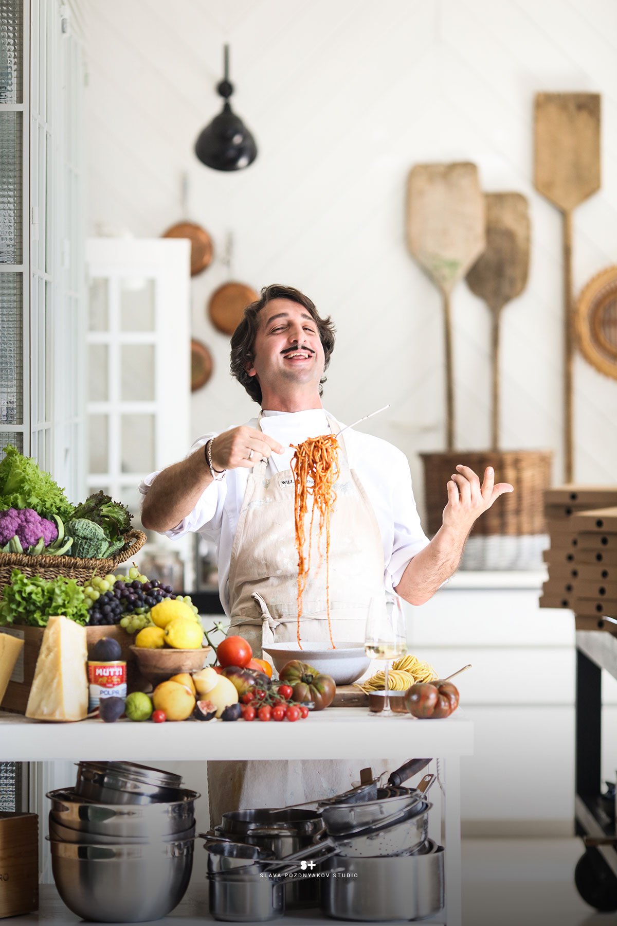 В результате нашей работы были сняты продуктовые постеры и портреты в интерьере, выдержанные в итальянском стиле. Это отразило дух итальянского шеф-повара, который специализируется исключительно на итальянской кухне и подаче блюд. Моя миссия заключалась в том, чтобы передать эту тему через создание интерьера, фона и атмосферы в кадре, а также в подборе реквизита и продуктов для фотосессии. Часть реквизита была взята с моей кухни-студии, которая была стилизована в соответствии с этим проектом.
