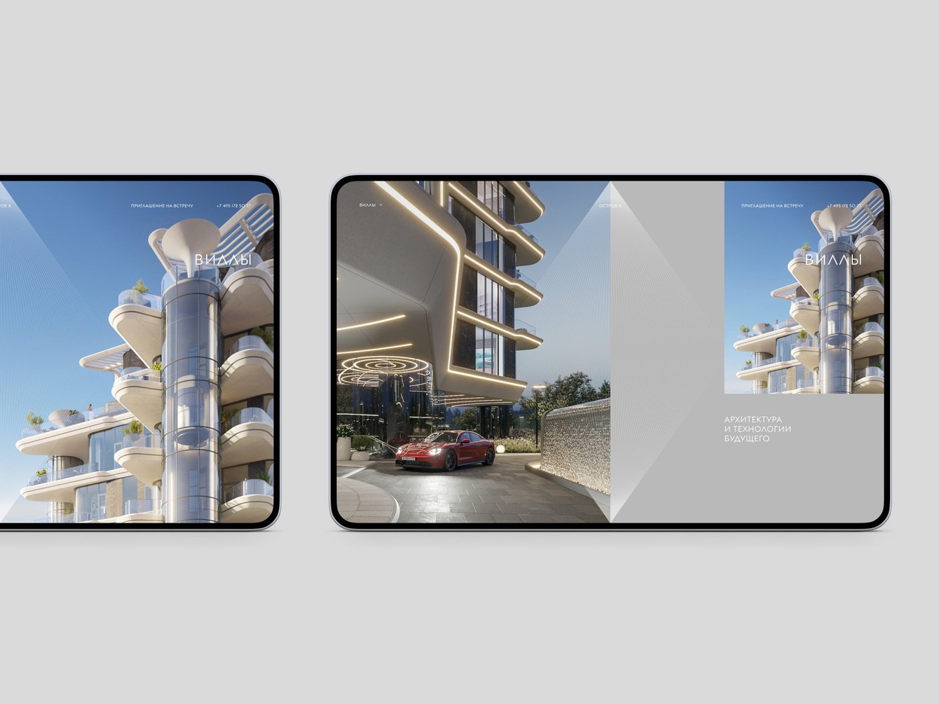 Линии логотипа перекликаются с деталями зданий — крышами вилл. Эту связь можно усилить, построив из таких же линий более сложные анимированные фигуры, повторяющие элементы архитектуры и интерьеров. Динамические трехмерные формы, трансформирующиеся от блока к блоку, должны были стать вишенкой на торте.