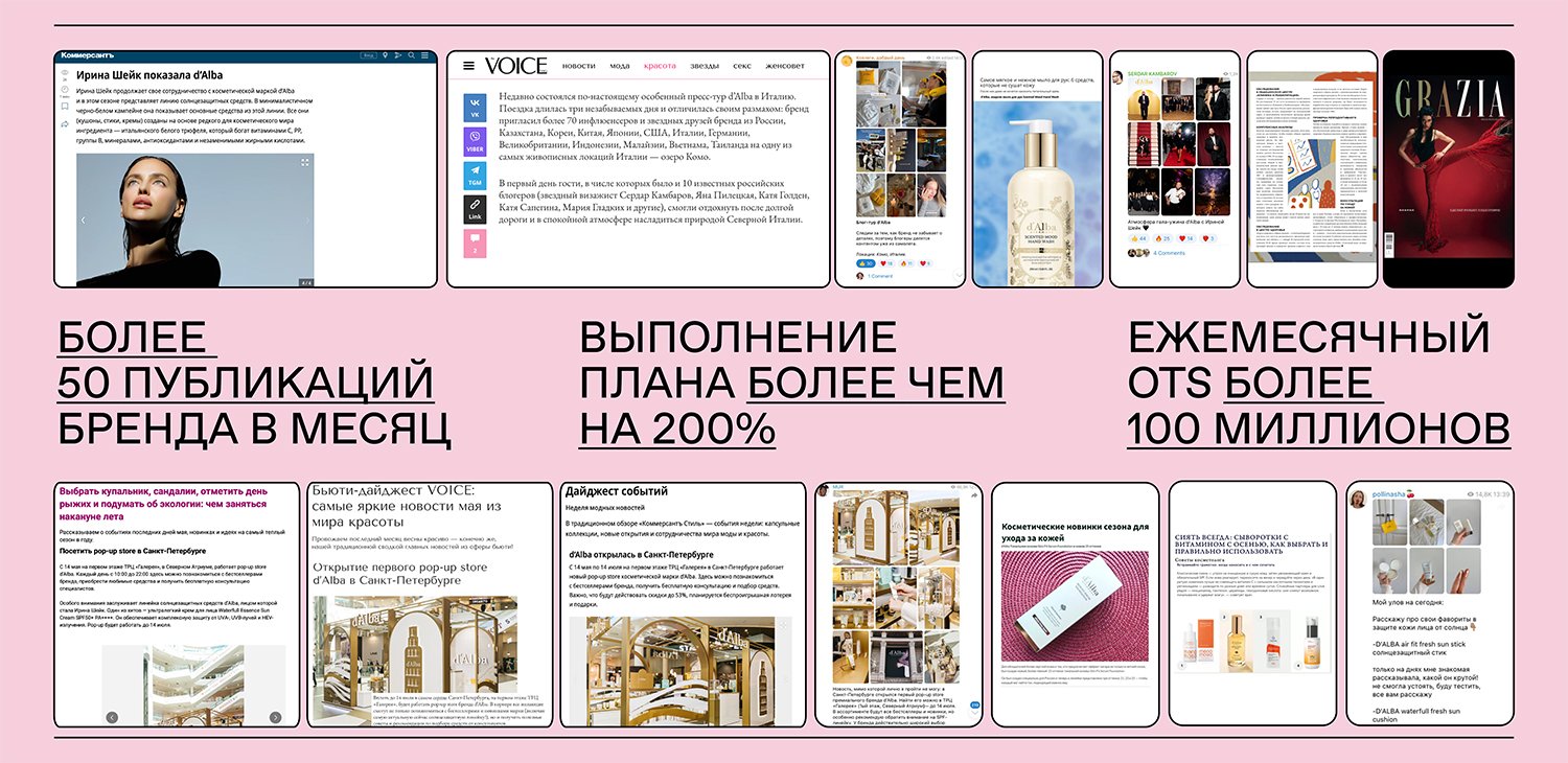 Перед агентством стояла задача запустить бренд d’Alba на российском рынке с нуля, адаптировать глобальную стратегию под локальные реалии, системно выстроить отношения со СМИ и инфлюенсерами, обеспечить устойчивую узнаваемость бренда в условиях высокой конкуренции и регулярное присутствие d’Alba в информационной повестке.