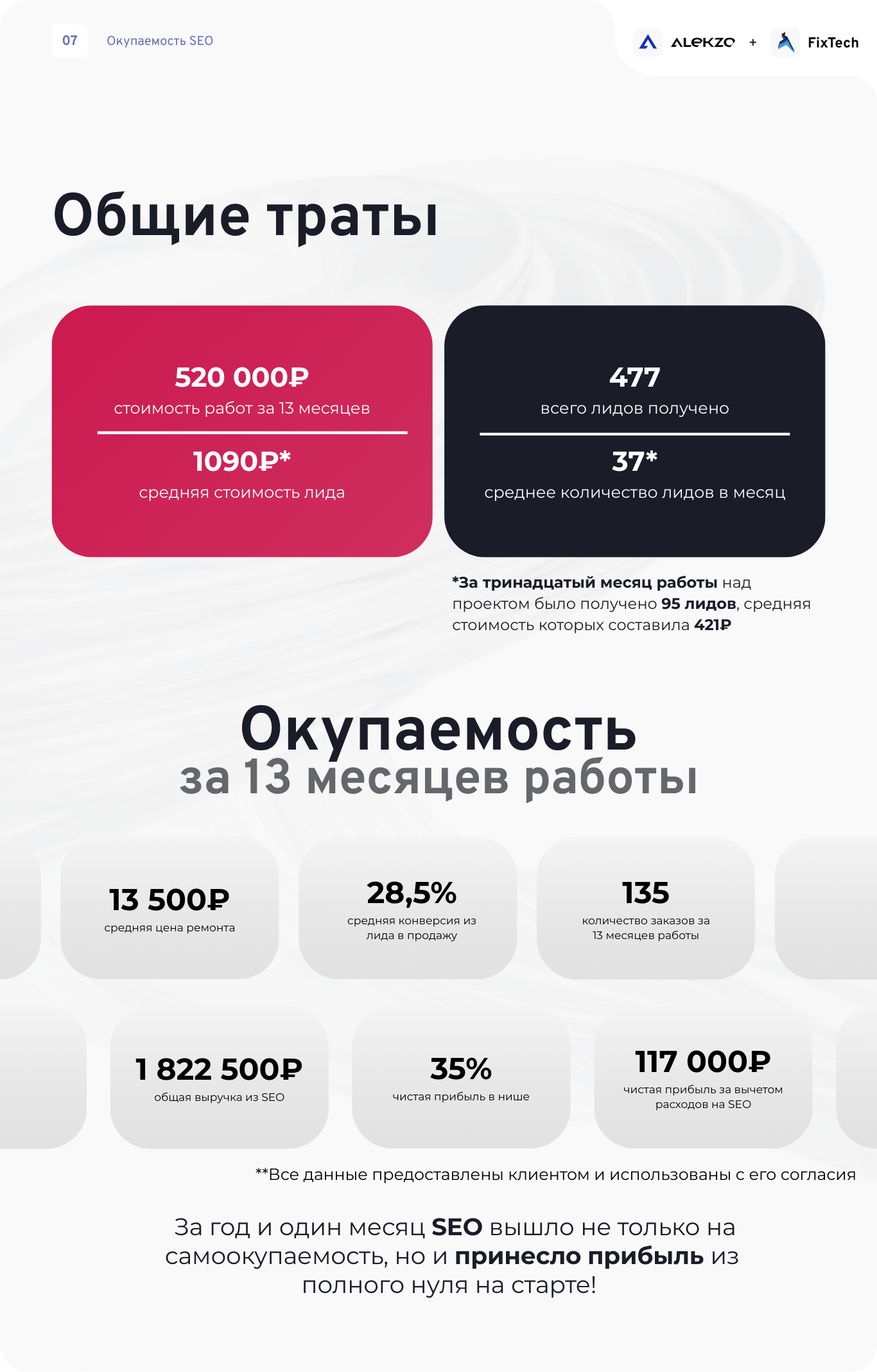За время работы над проектом клиентом было потрачено 520 000 RUB (напоминаю, что проект - на белорусский рынок, с немного другими бюджетами, в отличие от Москвы и России в целом) + это наш старый клиент, для которого мы были готовы вложиться больше, чем нужно, чтобы в дальнейшем работать на более выгодных для себя условиях