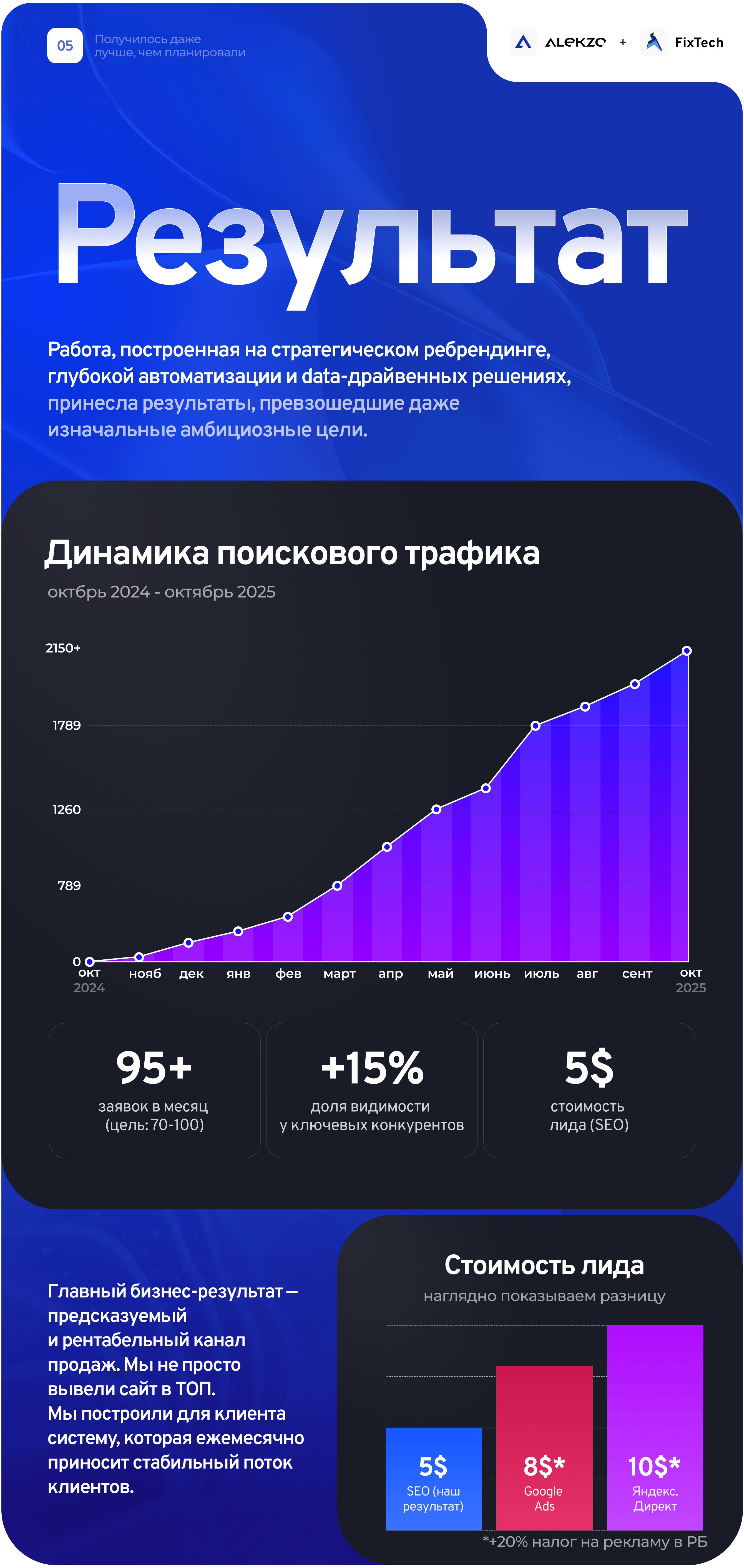 ‼️ Итог: Мы превратили идею и старый сайт в прибыльный актив, который работает как часы. Через год после старта с полного нуля клиент получил автоматизированную фабрику лидов, которая приносит 100+ заявок ежемесячно и продолжает наращивать обороты. Этот кейс доказывает, что даже в условиях жёсткой конкуренции и ограниченного бюджета можно добиться выдающихся результатов, если заменить шаблонные действия стратегическим мышлением и технологичными решениями.
