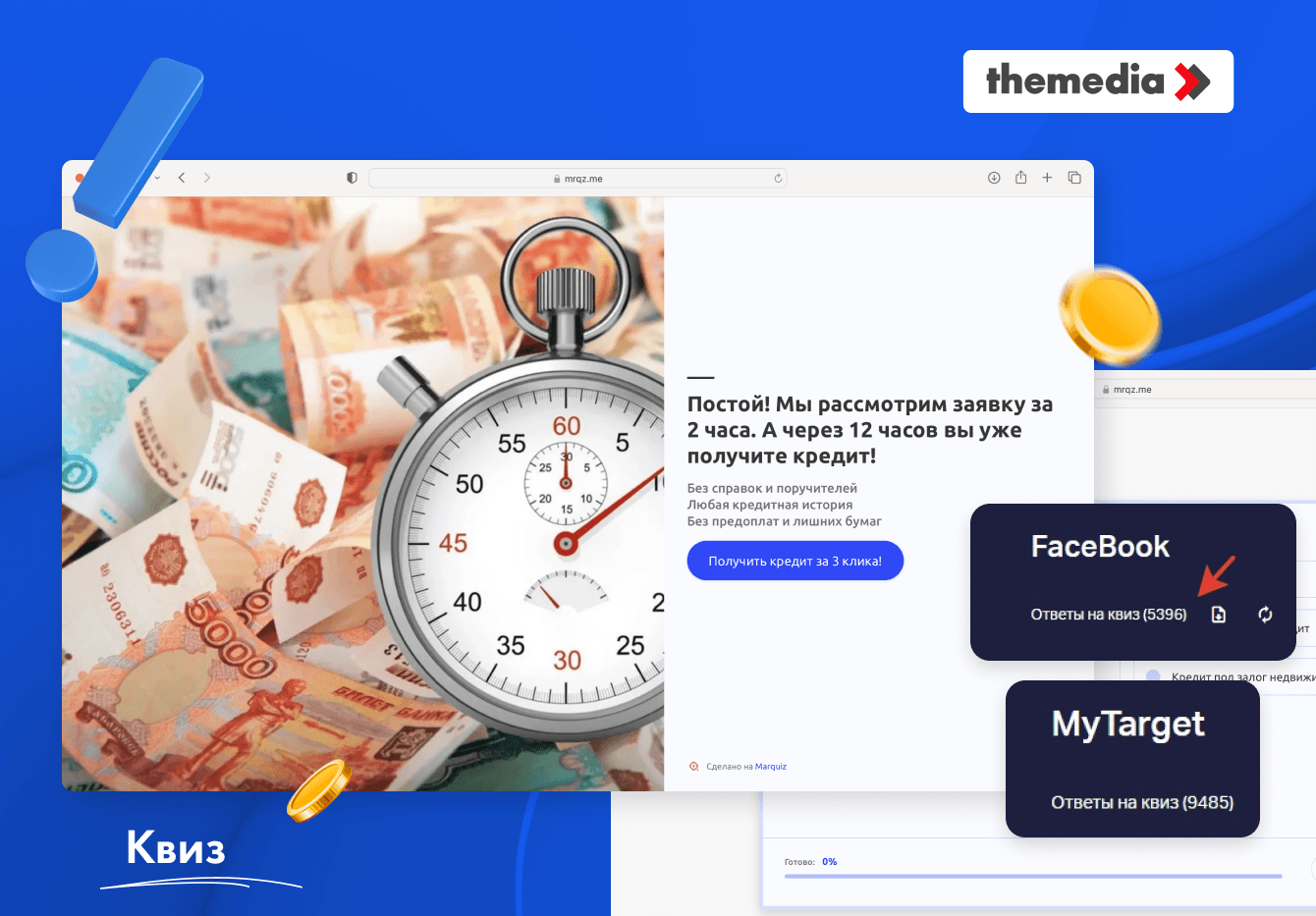 6. MyTarget (на посадку) – QUIZ (прохождение вопросов) – Файл: Как 100% получить кредит - Посадочная страница (CTA: Получить кредит) – Контактные данные – Отбивка по СМС