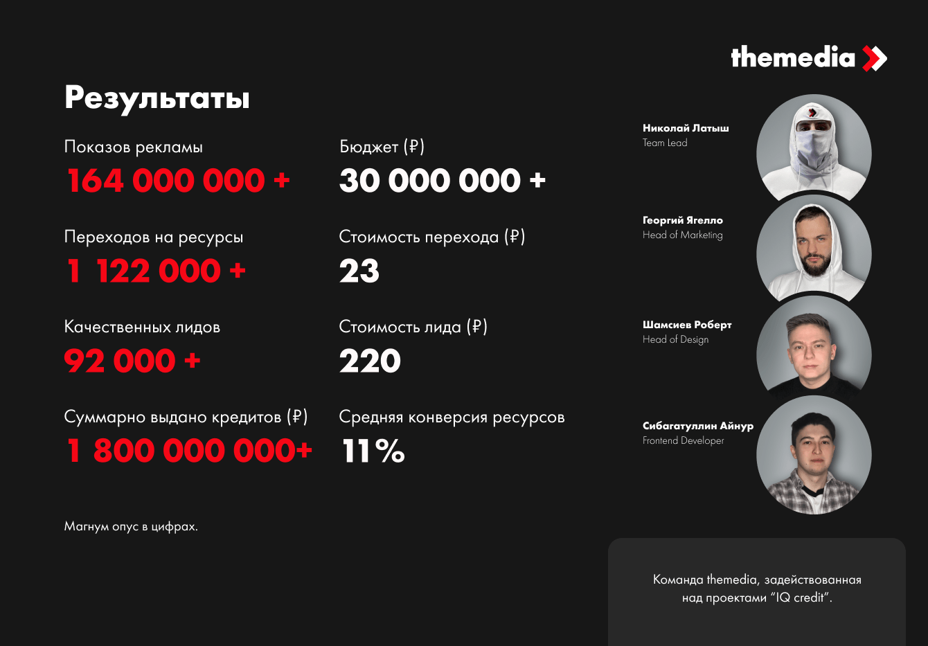 Компания IQ Credit в лице Генерального директора Якименко Артема Юрьевича выражает признательность и благодарность маркетинговому агентству themedia за достижения поставленных целей по итогам 2019 - 2022 г. В 2019 - 2022 году, несмотря на высокие темпы и непредсказуемость конъюнктуры рынка кредитования, благодаря быстрой реакции сотрудников компании, оперативному тестированию новых рекламных гипотез и площадок, креативу, а также общему профессионализму команды агентства themedia, удалось не только сохранить, но и увеличить объем лидогенерации и привлечения новых клиентов. Отдельно хочу отметить высокий уровень стрессоустойчивости команды, умение выслушать, протестировать и добиться желаемых результатов.