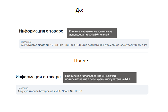 2️⃣ Полученный список уникальных запросов мы разделили на три группы по частотности. После этого были внесены корректировки в заголовки, характеристики и описания карточек с учётом правил распределения ключей разной частотности.
