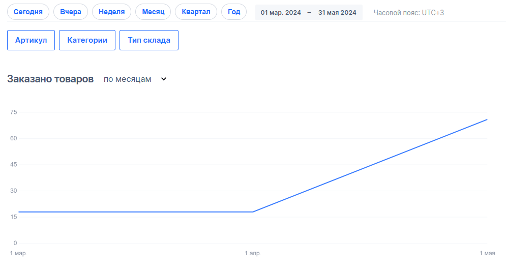 В мае, через месяц после начала работ, количество проданных товаров составило 71 единицу: