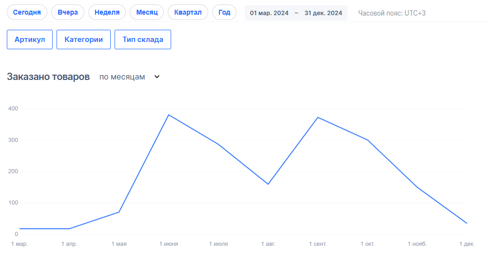 График продаж за период с 1 марта по 31 декабря 2024 (продажи в единицах). Уменьшение продаж в августе связано с ростом курса доллара, которое повлекло за собой увеличение стоимости товара. В ноябре в магазине уже практически не было ассортимента (оставалось порядка 5 моделей по 1-2 ед.), а в декабре товар закончился и мы остановили работы: