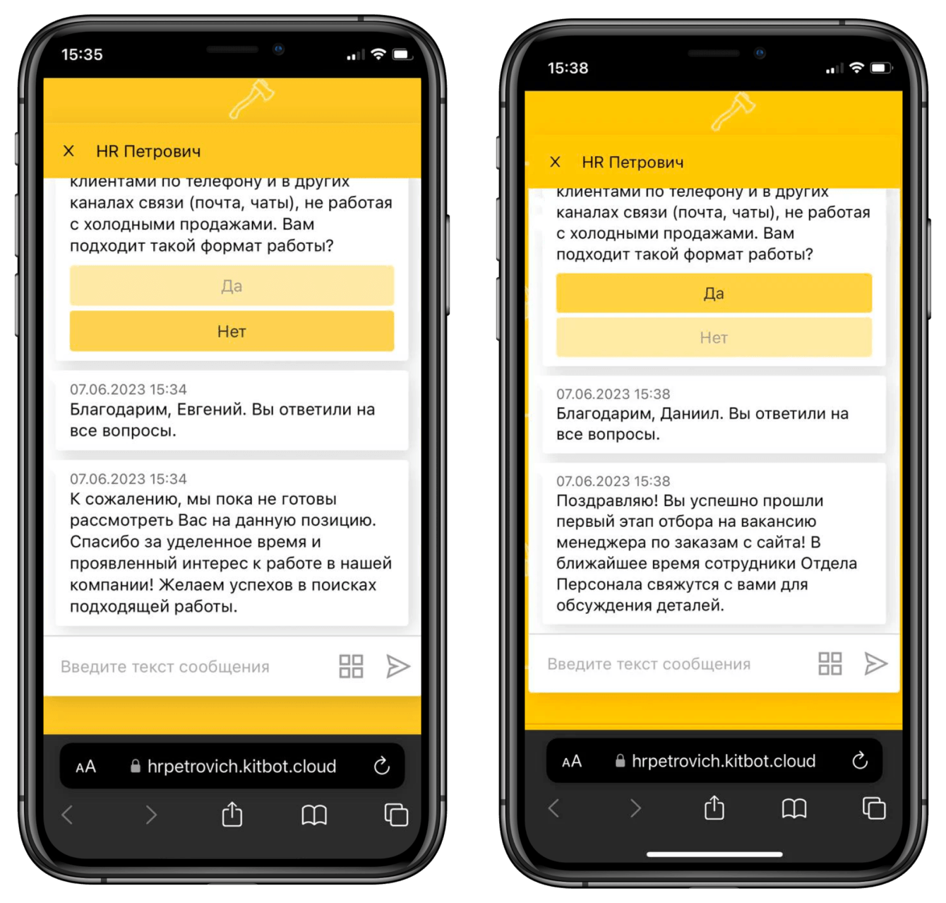 В системе настроено 10 сценариев интервью, разработанных для разных вакансий. Например, для операторов заказов в дневную и ночную смены используются разные сценарии, а кандидат получает ссылку, соответствующую его вакансии.