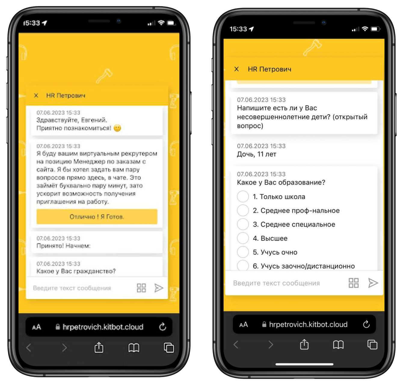 Интервью проходит в веб-версии чат-бота. Это решение выбрали, чтобы учесть особенности аудитории: у многих кандидатов устаревшие телефоны, и мессенджеры для них неудобны.