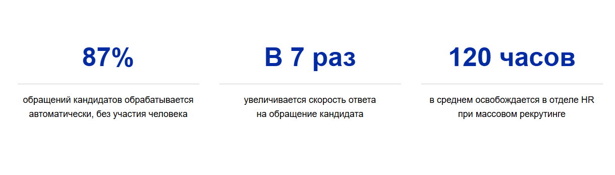 - Освободить время рекрутеров для работы с сильными кандидатами. Отсеять нерелевантных кандидатов, которые не подходят по базовым требованиям.