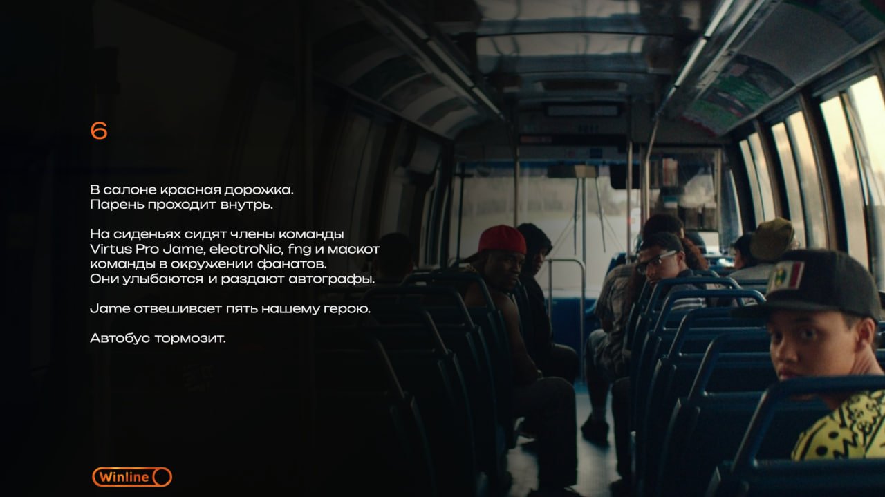 Герой просыпается в своей комнате, а вокруг оживают персонажи из Dota 2 и Counter-Strike. Он едет в брендированном автобусе Virtus.pro, попадает на премию и киберспортивный турнир — и всё это благодаря Winline.