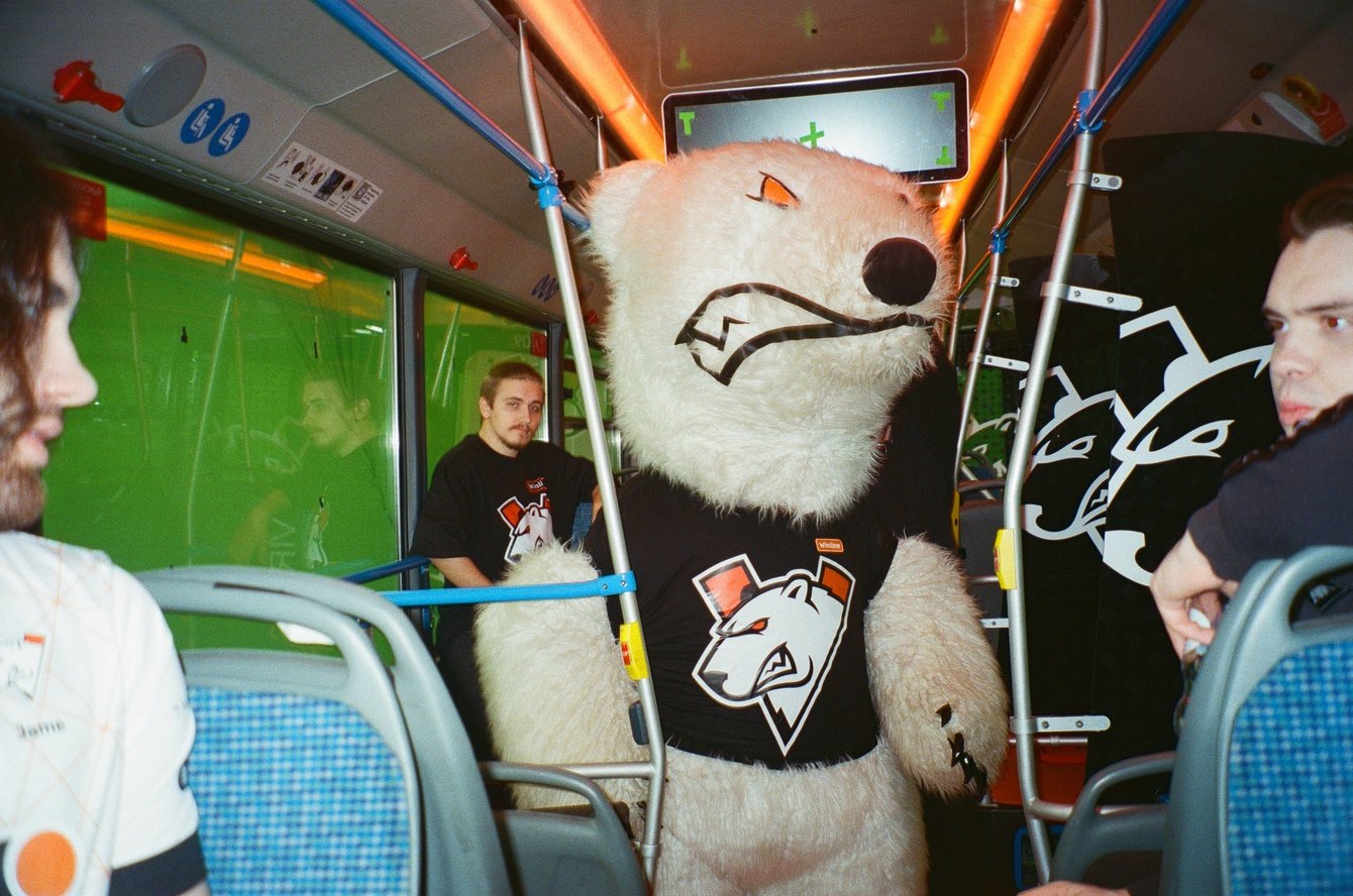 Художники построили лифт с движущимися этажами и световой индикацией. Но главным испытанием стала эпопея с городским автобусом. Мало того, что его нужно было завести в павильон (что уже казалось миссией невыполнимой), так еще и придумать, как показать транспорт команды Virtus.pro — здесь нам помогла оранжевая подсветка, отсылка к бренду.