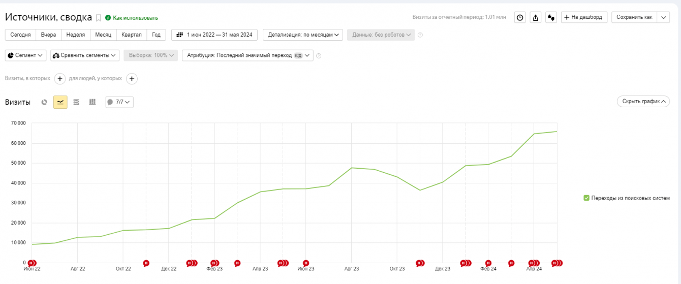 Однако менее чем через два года активных SEO-работ ситуация коренным образом изменилась - к маю 2024 года количество посетителей из органического поиска выросло до впечатляющих 65 798 в месяц!