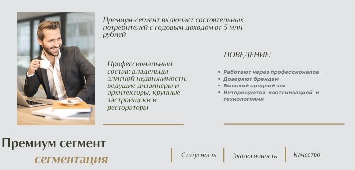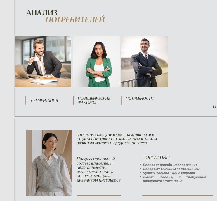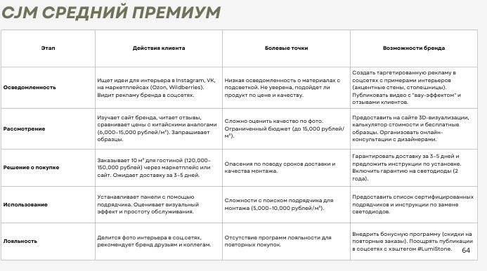 На этом этапе я выделила целевые сегменты (частные покупатели, дизайнеры интерьеров, строительные компании, девелоперы), прописала buyer-persona бренда и создала под каждый сегмент CJM -- определение ключевых потребностей и критериев выбора для каждого сегмента, а также точек касаний с брендом.