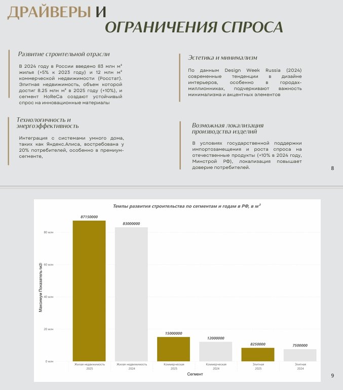 Провела комплексный анализ рынка на территории РФ. Для этого я оценила объем и динамику рынка как за прошедшие периоды, так и смогла сделать прогноз на будущие три года. Оценивала рынок по сегментам - натуральный камень, искуственный камень, кварцевый агломерат.