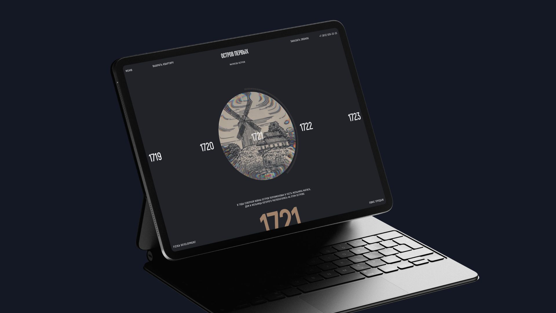 Наш взгляд на экран постепенно фокусируется от общих видов на конкретные даты, постепенно превращаясь в таймлайн, неумолимо фиксирующий ключевые исторические вехи через эффект жидкого стекла.