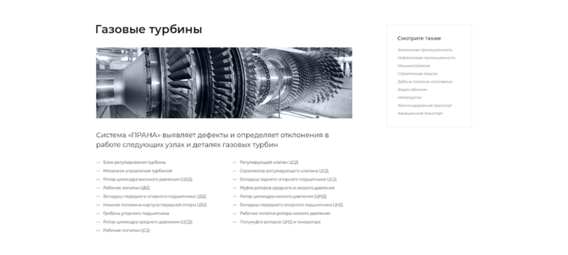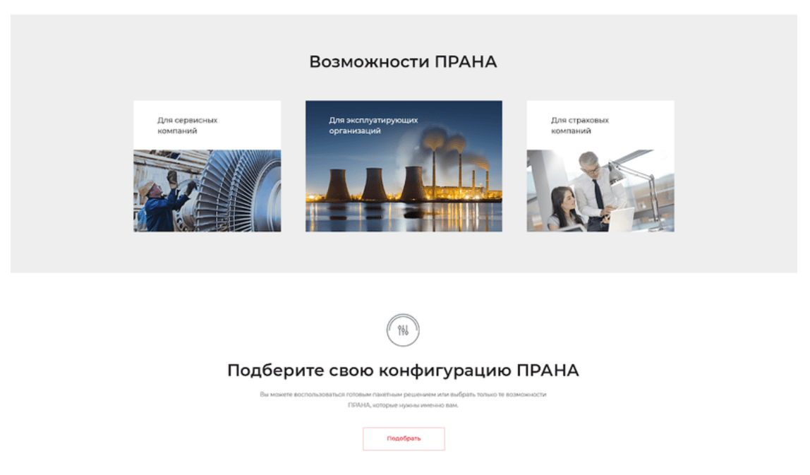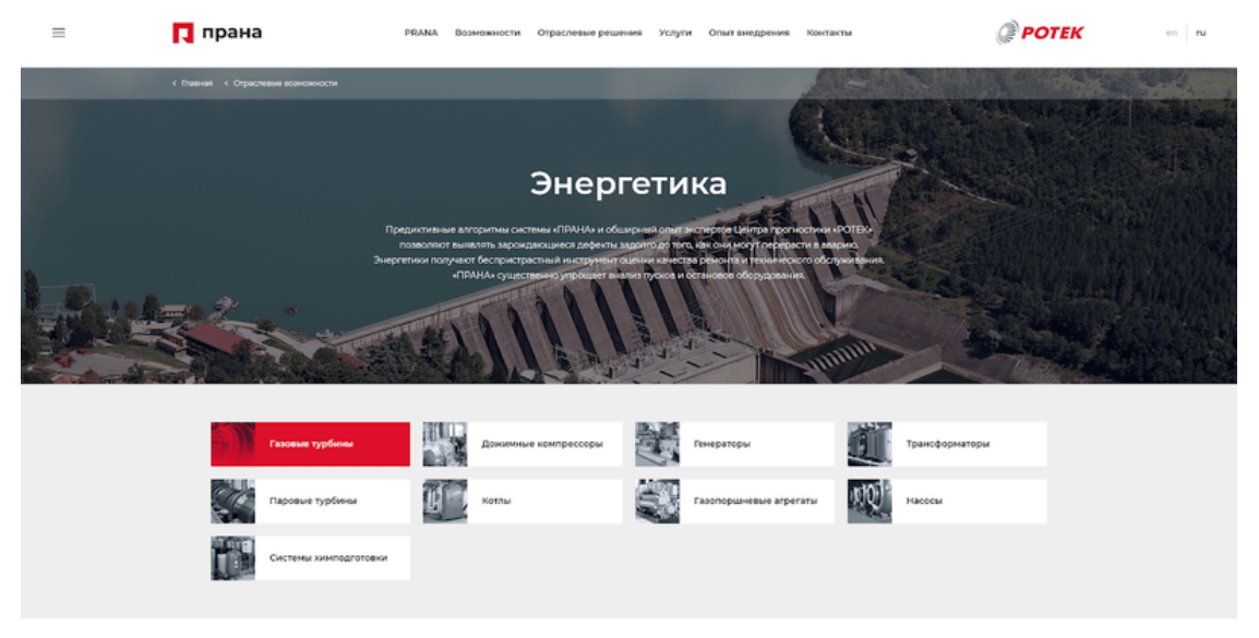 Был утвержден более сдержанный макет главной. Также мы подготовили несколько внутренних страниц. Многие мы рисовали в зависимости от контента, который был у клиента и потребностей целевой аудитории конкретной страницы. Например, страница решений для энергетической отрасли: