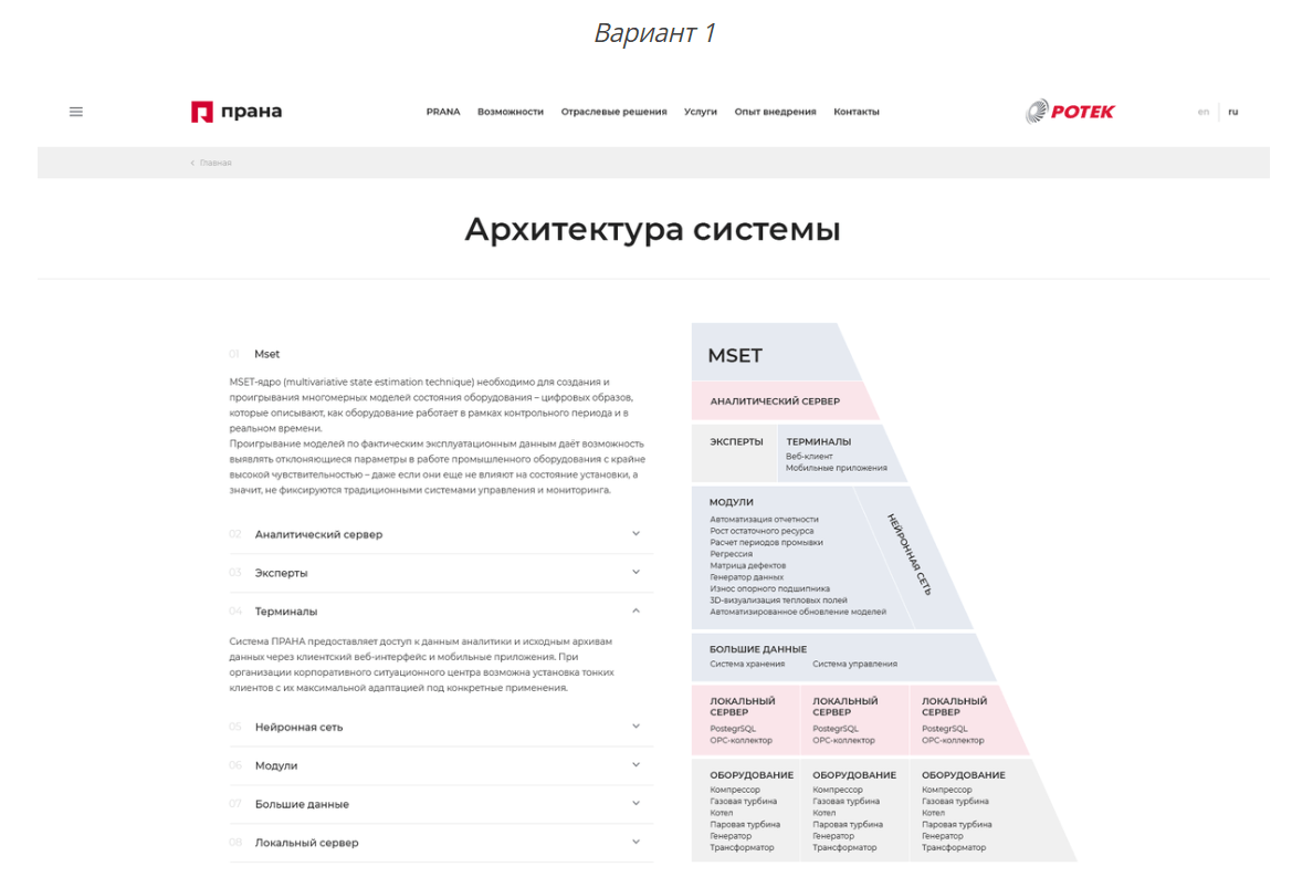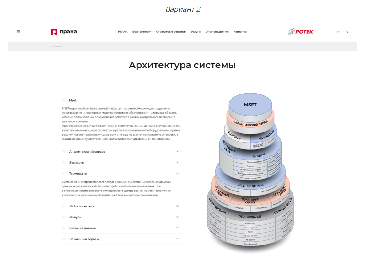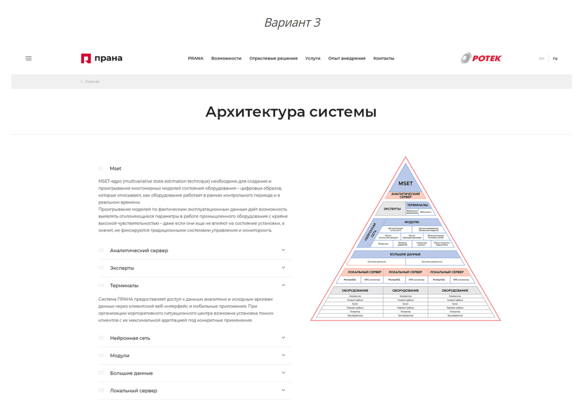 Например, для страницы «Архитектура системы» мы разработали три варианта визуализации.