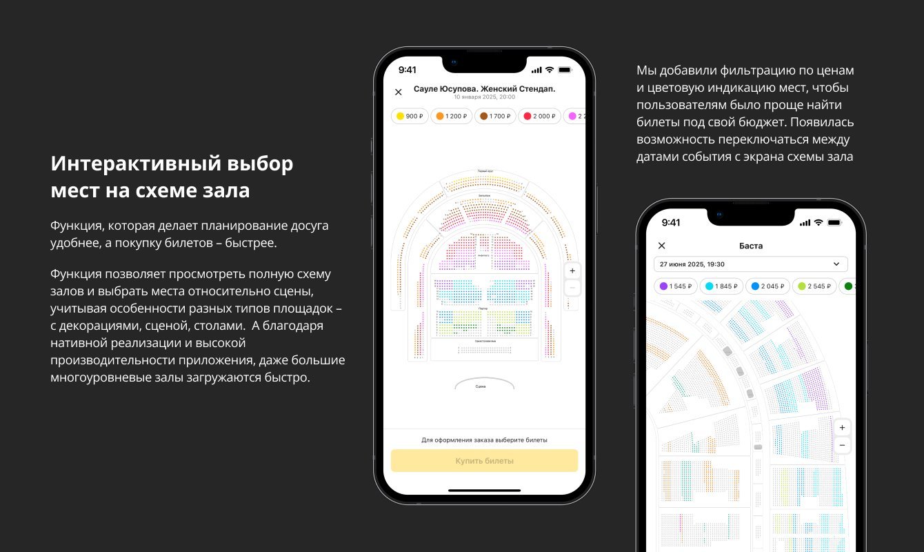 «Мы старались успеть с внедрением новой функции к новогодним мероприятиям и каникулам. Результатом мы довольны: схемы залов даже на площадках с десятком тысяч мест открываются быстро и работают отлично. Всё это уже дало свой эффект и позитивно повлияло на показатели приложения в важный период предновогодних покупок».