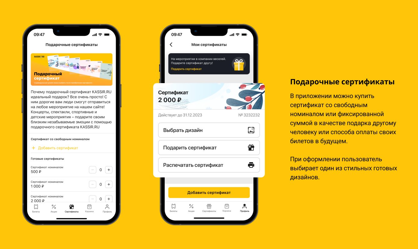 Эмоции и билет на мероприятие можно подарить: приложение позволяет оформить сертификат любого номинала в одном из ярких дизайнов, и отправить его из приложения на электронную почту.