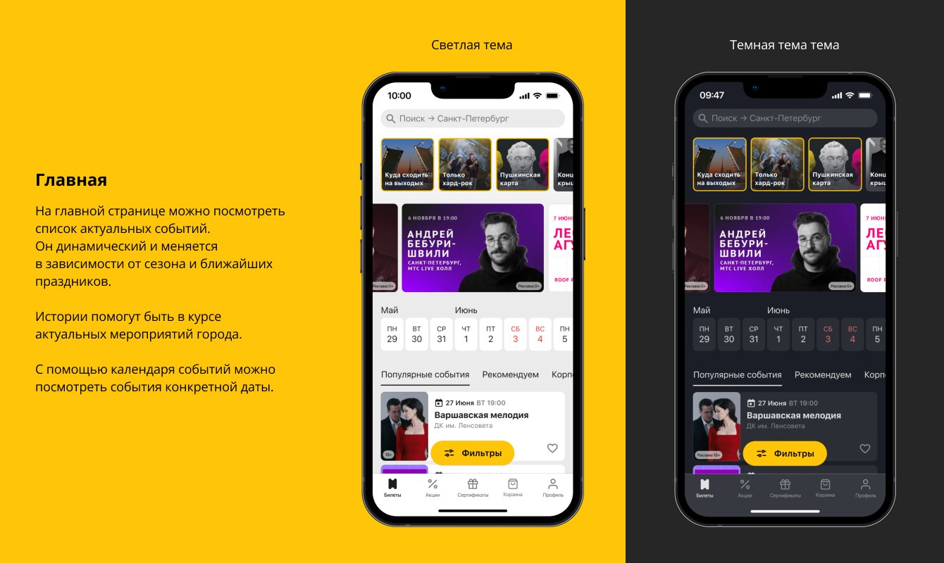 Главная страница показывает самые интересные и громкие мероприятия, которые нельзя пропустить. Новости об акциях и топовых ивентах зрители узнают в привычном и удобном формате — сторис.