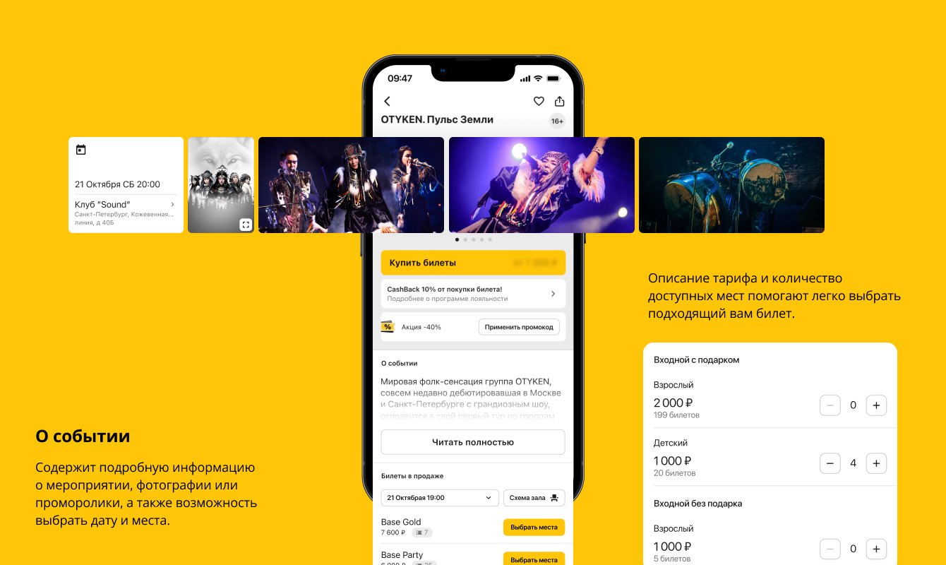 На экранах мероприятия содержится полная информация: описание, фотографии, проморолики. Человек может выбрать билет на схеме зала в соответствии со своим бюджетом и пожеланием расположения места.