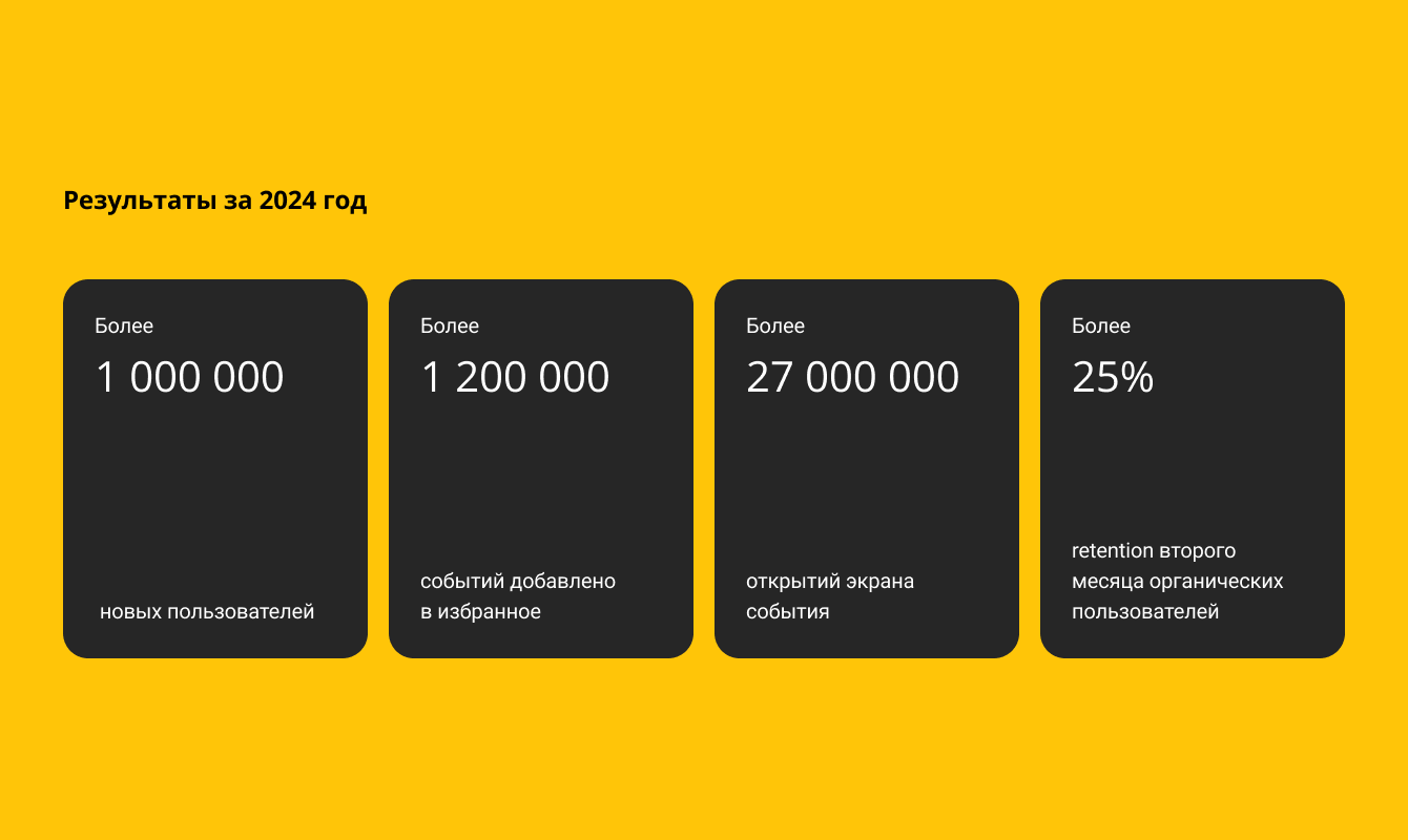 С самого первого релиза мы проводили исследования и анализ конкурентов и предлагали заказчику идеи для развития приложения. Основной задачей 2024 года стала работа над улучшением пользовательского опыта. Мы сфокусировались на производительности и удобстве, чтобы каждый клиент Kassir смог легко и быстро купить билет на интересное ему событие.