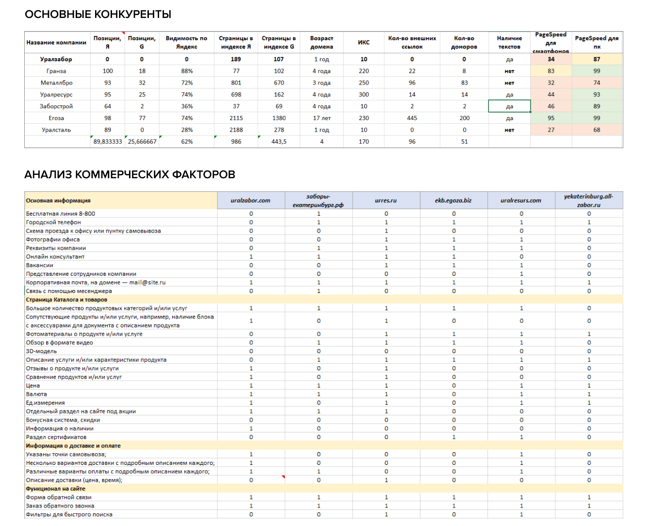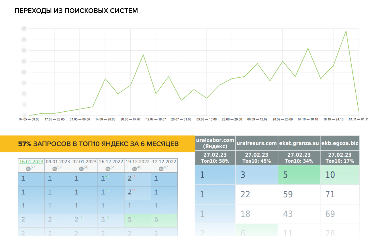• Небольшой ссылочный профиль имеется у всех сайтов-конкурентов. В силу своей молодости у сайта uralzabor.com нет ссылочного профиля. Активным продвижением занимается компания Егоза