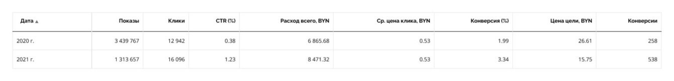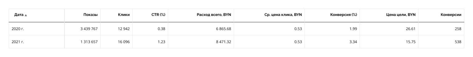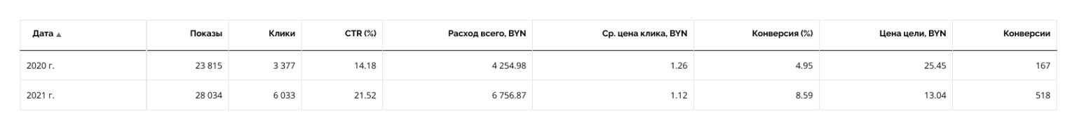 Это дало заметный эффект по всем основным каналам. В РСЯ число конверсий выросло с 258 до 538, а цена заявки снизилась на 41% с 26,61 BYN до 15,75 BYN.