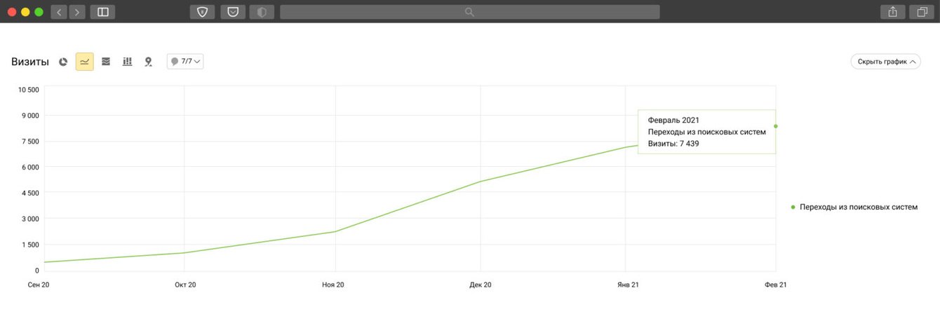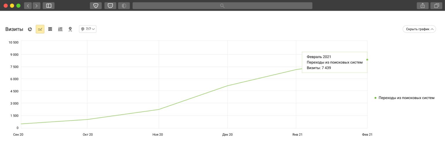 В результате SEO стало полноценным долгосрочным каналом роста. Органический трафик вырос с 200 до 1 800 пользователей в неделю, видимость сайта увеличилась с 1,3% до 2,5%, а доля ключей в ТОП-10 выросла в 2,8 раза. Для проекта это было важно не только как рост трафика, но и как усиление устойчивости маркетинга в целом.