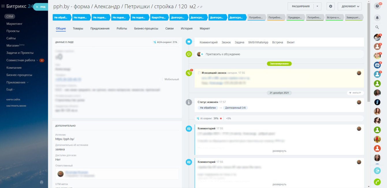 Отдельное значение имело подключение сквозной аналитики на базе CRM. В системе стали отображаться расходы по рекламным каналам, стоимость лида, показатели среднего чека и конверсии как по каждому менеджеру, так и по отделу продаж в целом. Благодаря этому маркетинг перестал существовать отдельно от продаж: стало видно, какие источники приводят обращения, как они обрабатываются и где теряется выручка.