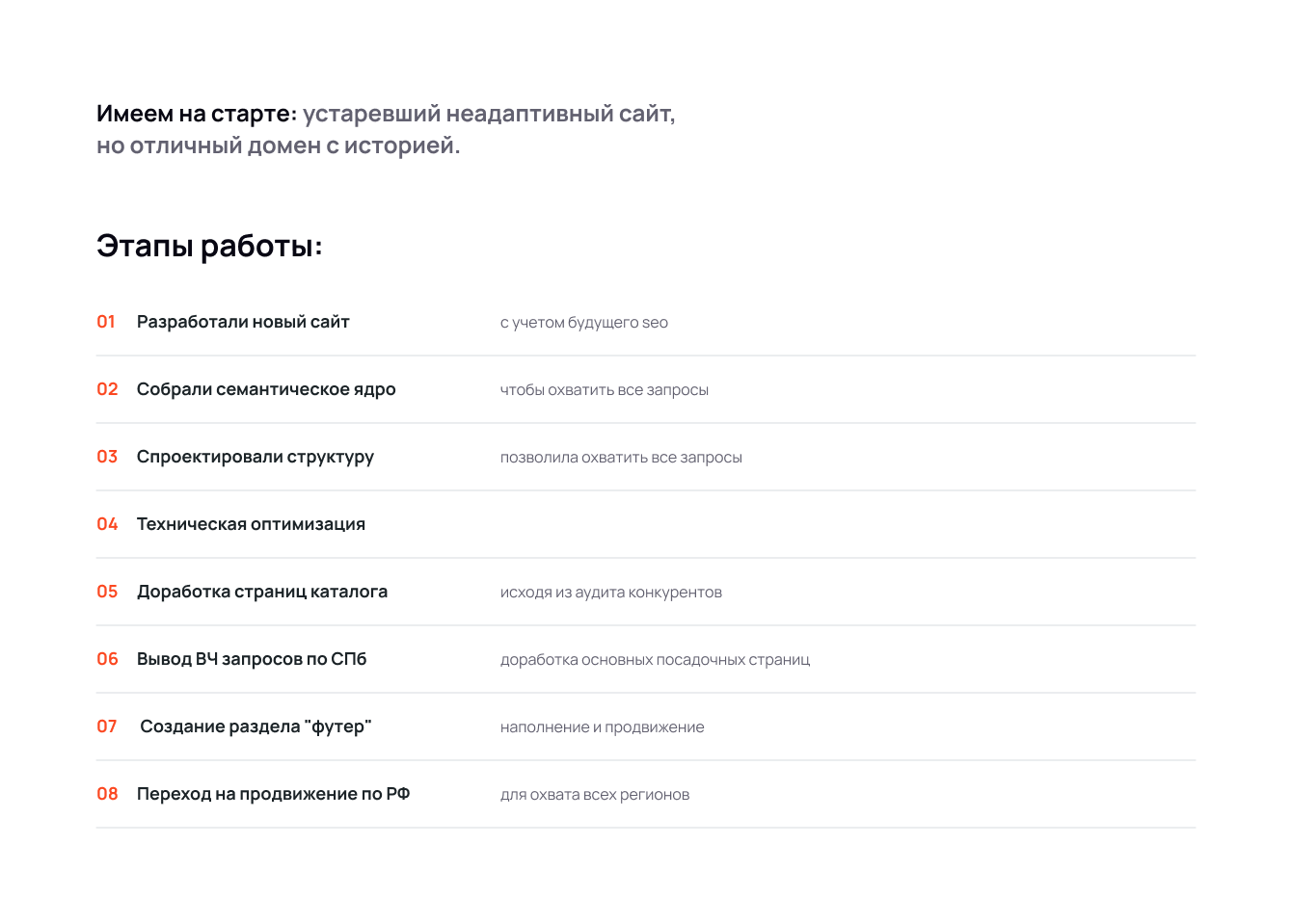 Достижение поставленной цели заняло 4 месяца работ (вместо ожидаемых 6). Конечно, после этого мы продолжили сотрудничать с клиентом. Помимо достигнутой цели, мы увеличили объем заказов из поиска — с 1000 до 2000 в месяц. Посещаемость сайта на данный момент — более 30 тысяч человек в месяц.