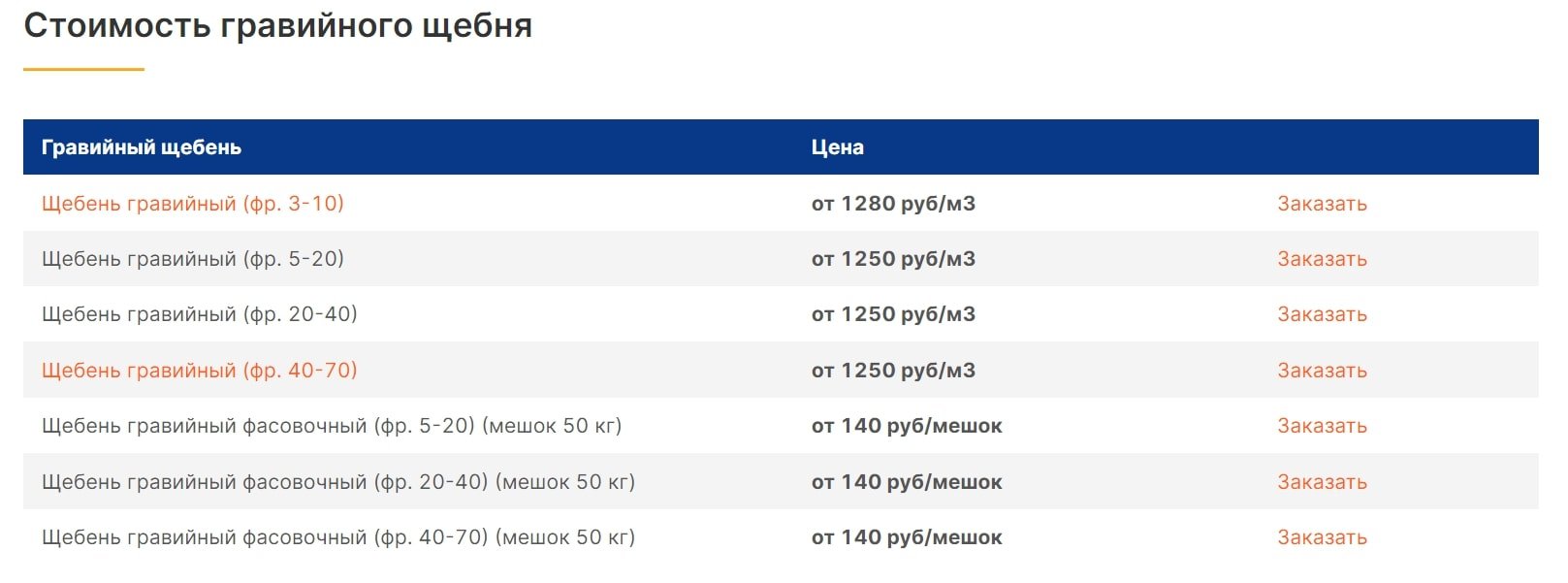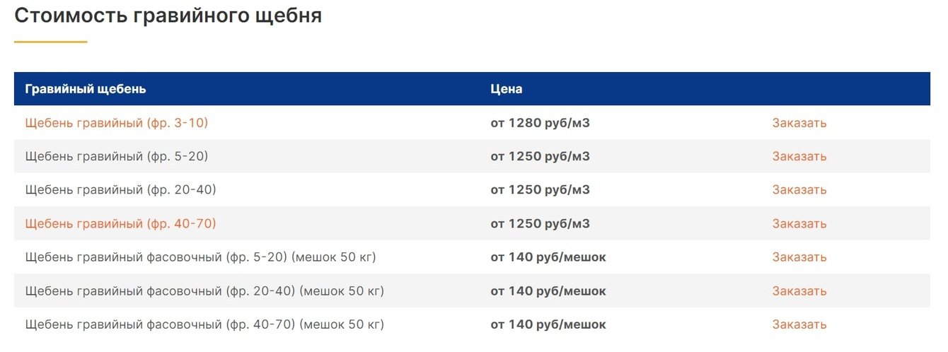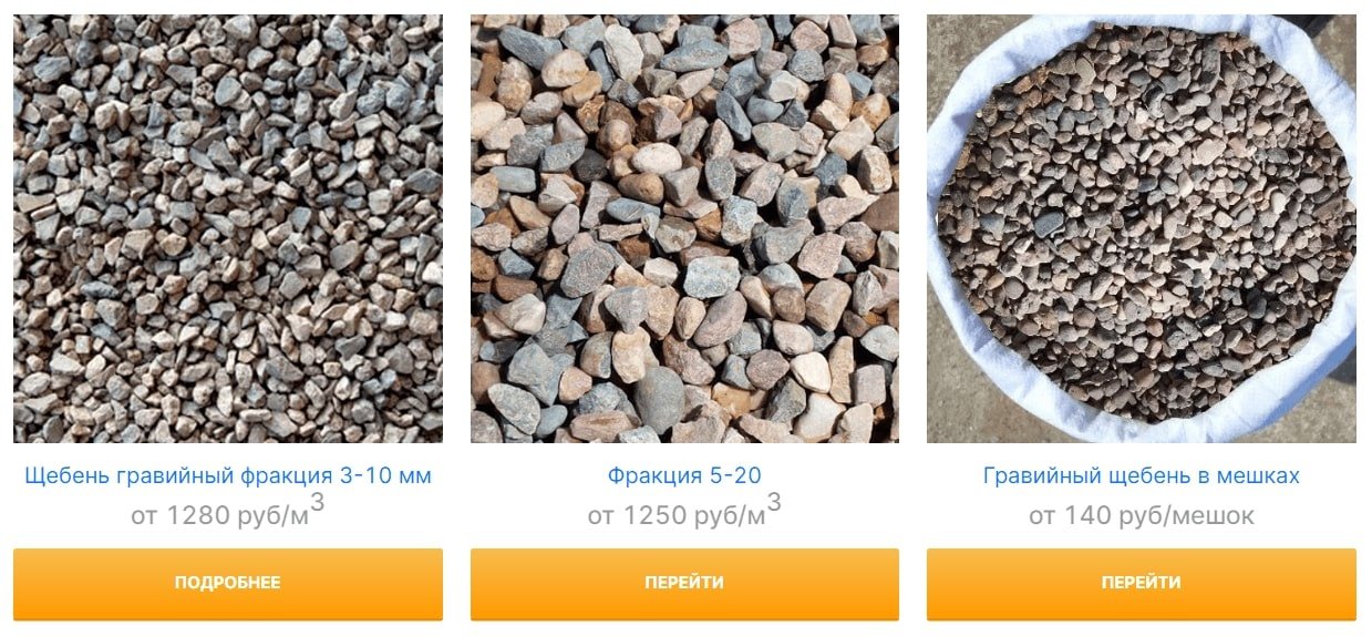 Далее добавили фотографии продукции с возможностью перейти на страницы отдельных категорий — щебень, песок, грунты и т.д.