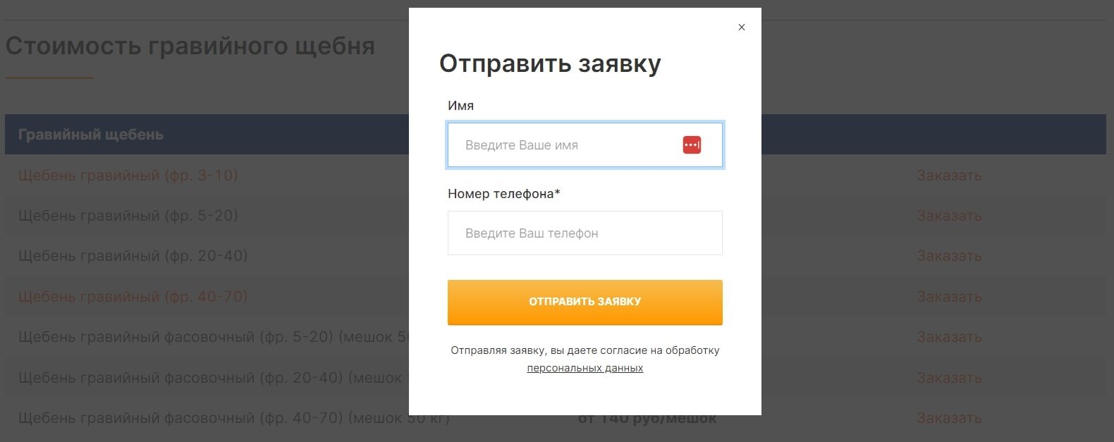 Чтобы сократить путь от просмотра к заявке, встроили таблицы с актуальными ценами и форму быстрого заказа, открывающуюся по клику на ссылку «Заказать».